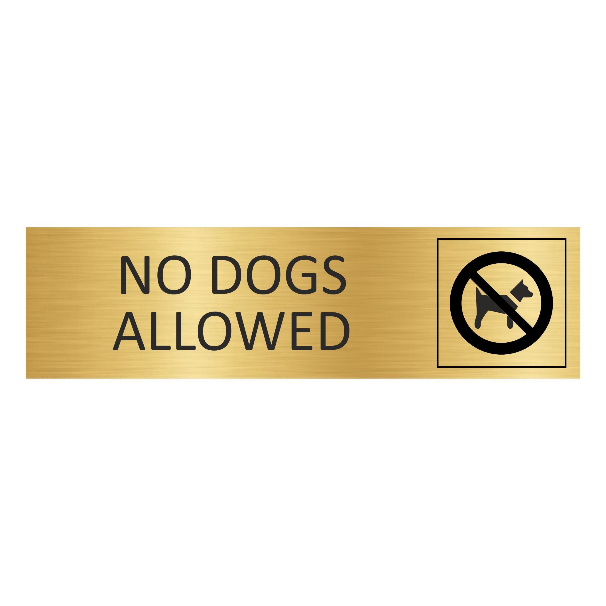 Gold-colored door sign featuring the text 'No dogs', made of high quality aluminum. The sign measures 165 x 45 mm and has double-sided tape for easy mounting. Suitable for indoor and outdoor use. Sold individually. Read more