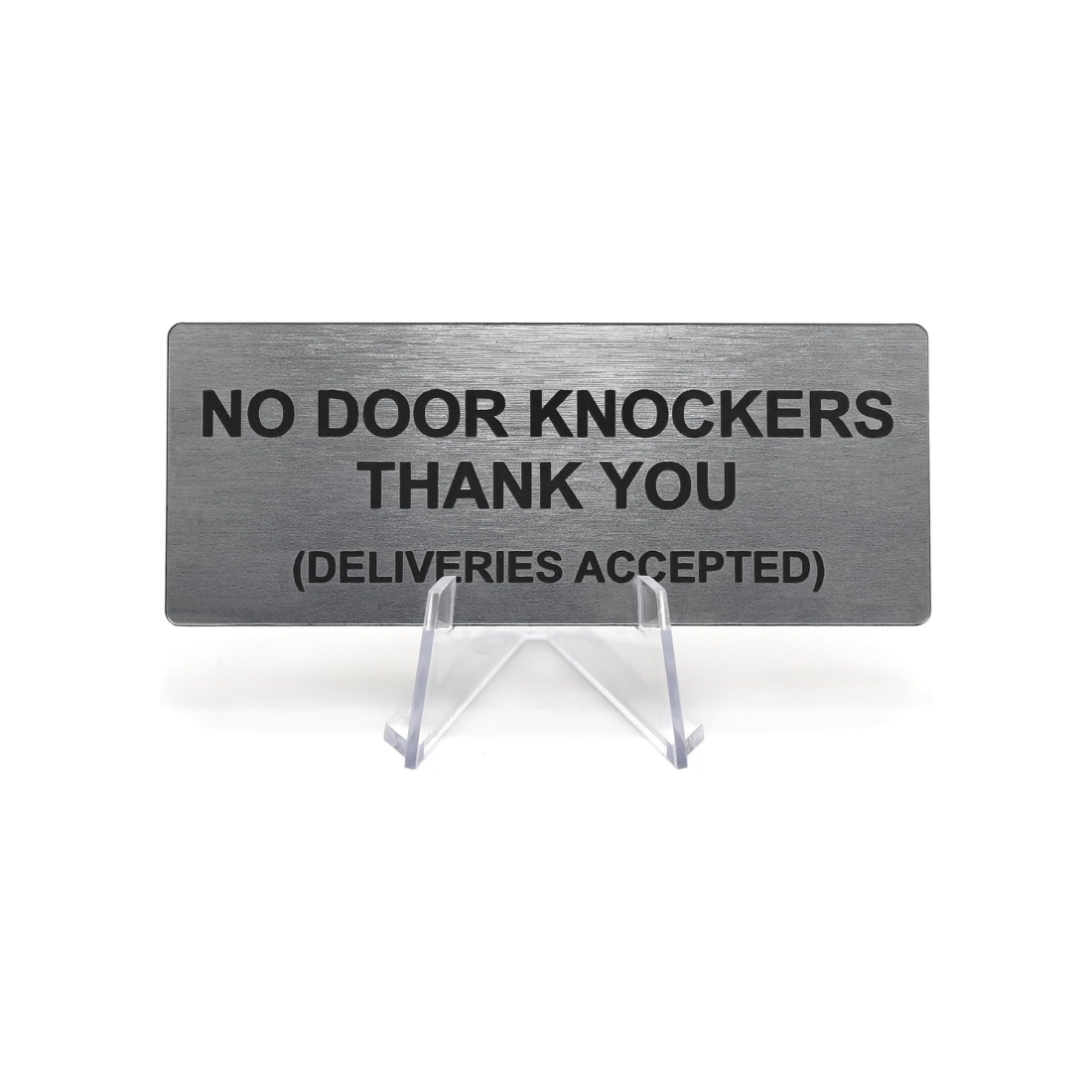 No door knockers sign with double-sided tape. This silver door sign measures 100 x 40 mm and can easily be placed near a front door or doorbell. It helps prevent unwanted solicitors or salespeople. Sold individually. Read more