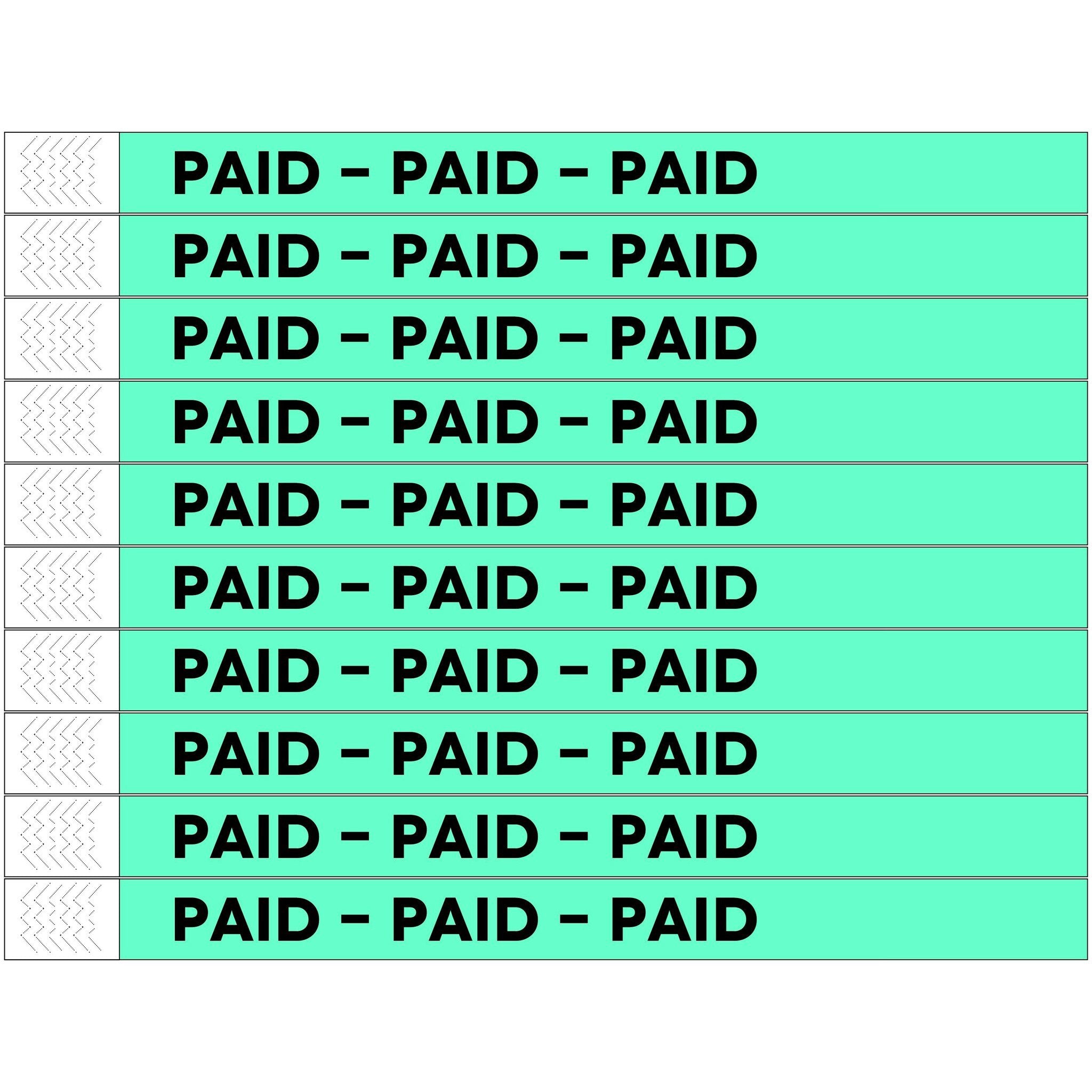 Paid Tyrex wristbands, measuring 248 x 19 mm. Used to identify guests that have paid the entry or service fee at all kinds of events. Each pack contains 100 wristbands with numbering and a strong adhesive strip.