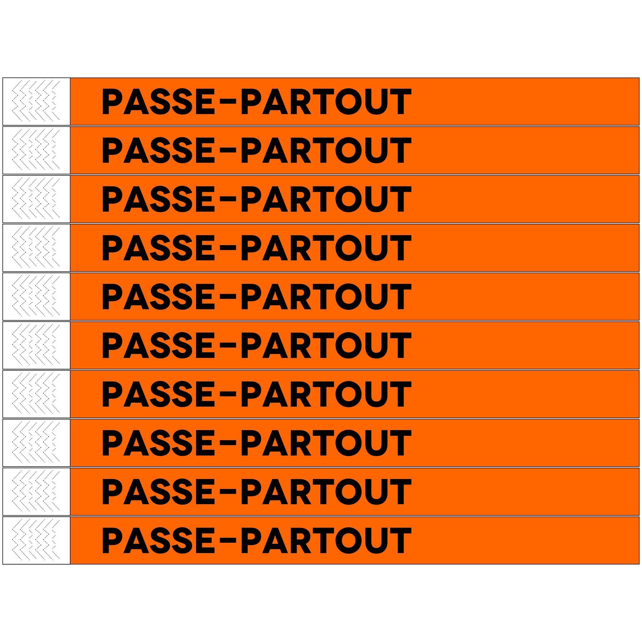 Neon oranje Tyrex polsbandjes met de tekst 'Passe-partout'. Ideaal voor zowel grote als kleine evenementen en activiteiten. De polsbandjes hebben afmetingen van 248 x 19 mm en worden geleverd op vellen. In een verpakking zitten 100 polsbandjes.