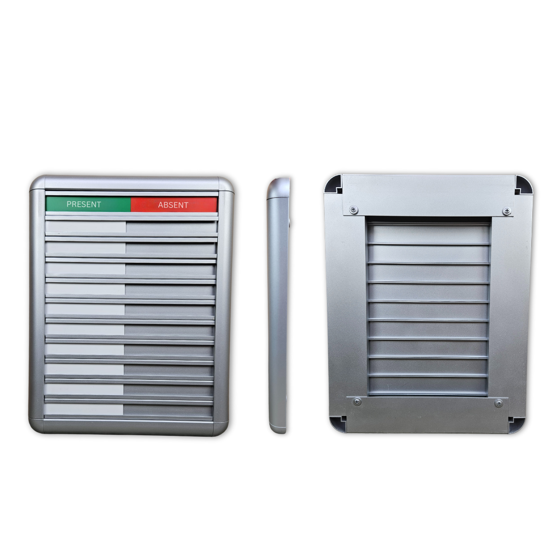 Aluminum present-absent board for 10 people measuring 25.7 x 33 cm. The name strips can be supplied blank or engraved. You can personalize the board with your logo, custom text, and font. Name strips are available either blank or engraved. Read more