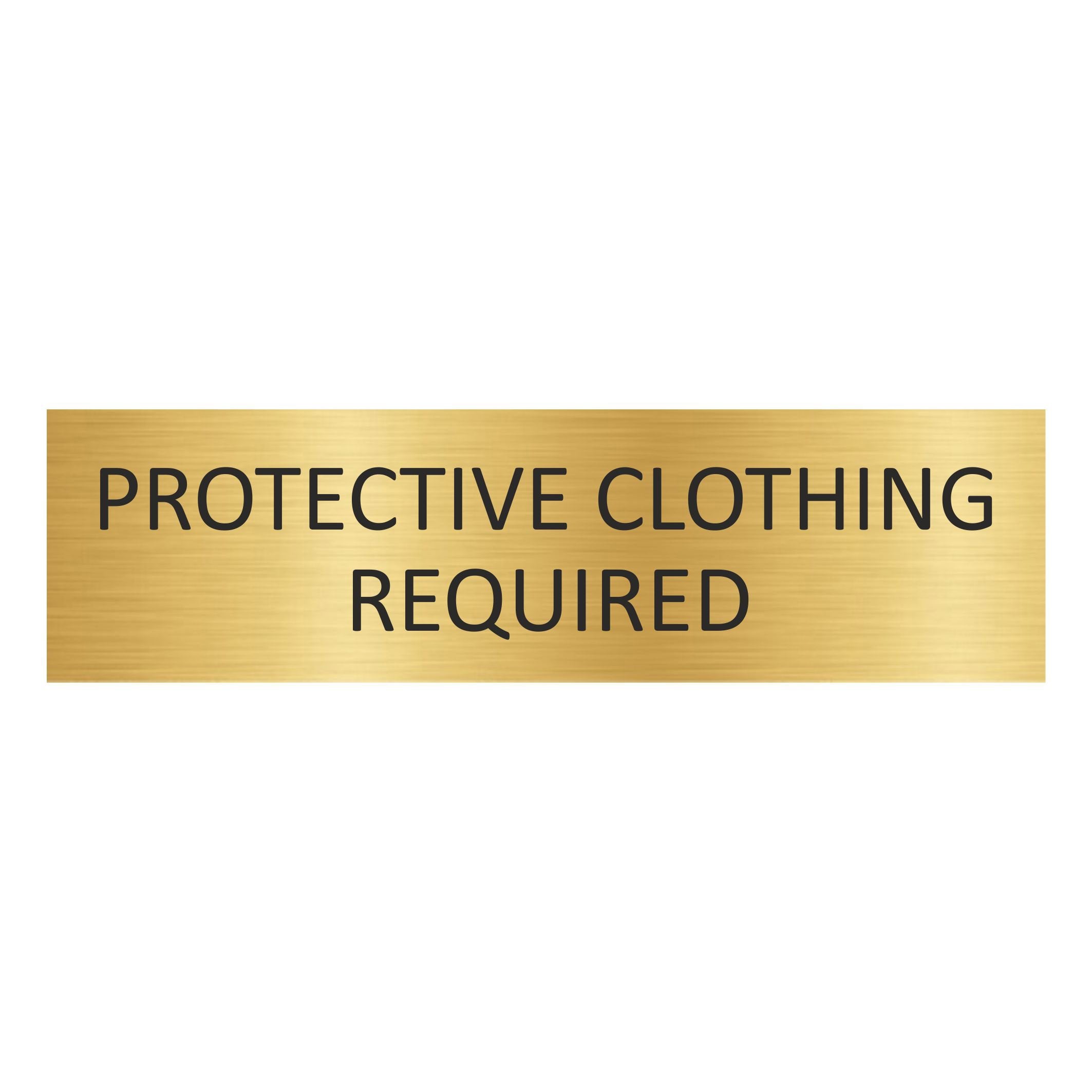 Gold-colored door sign featuring the text 'Protective clothing required', made of high quality aluminum. The sign measures 165 x 45 mm and has double-sided tape for easy mounting. Suitable for indoor and outdoor use. Sold individually.