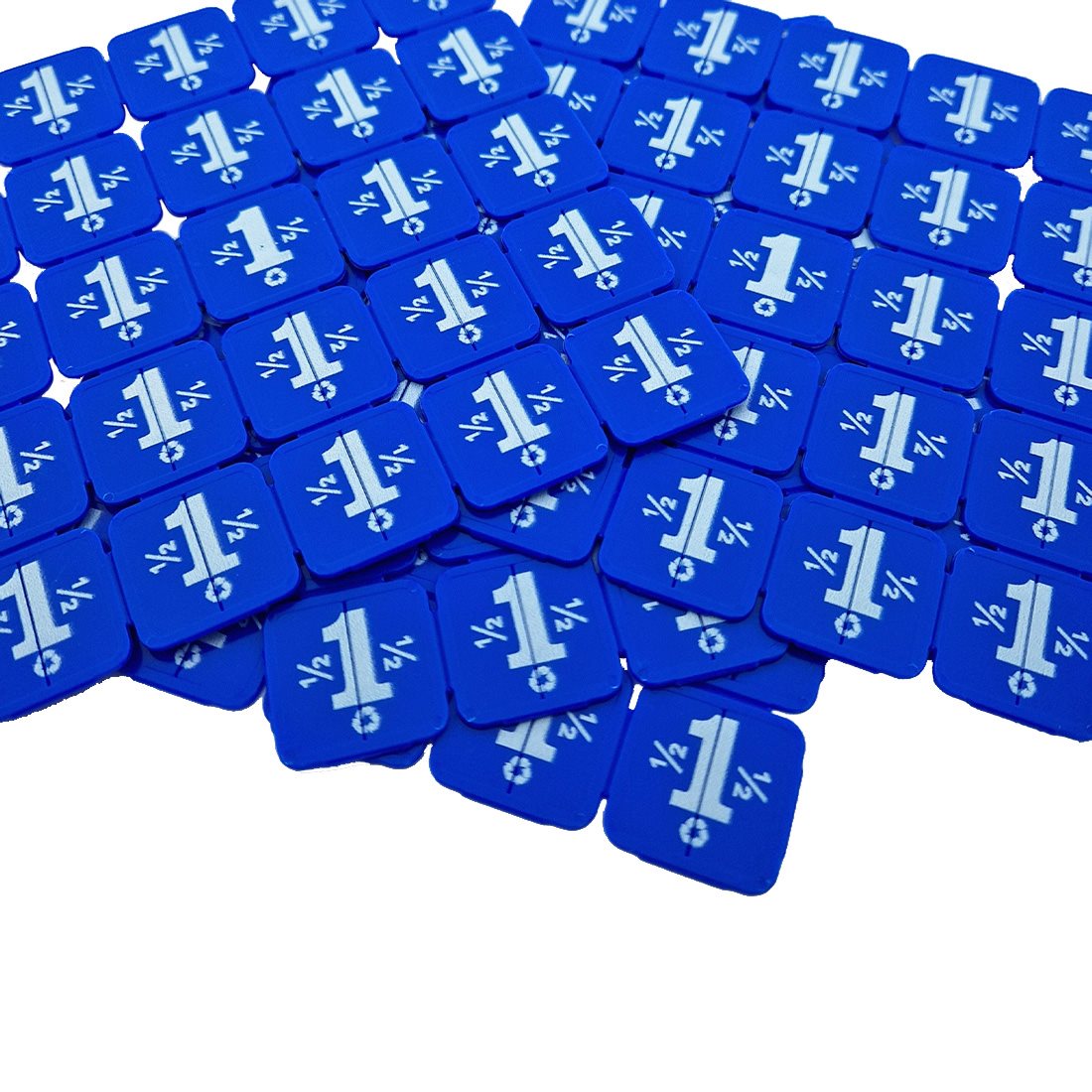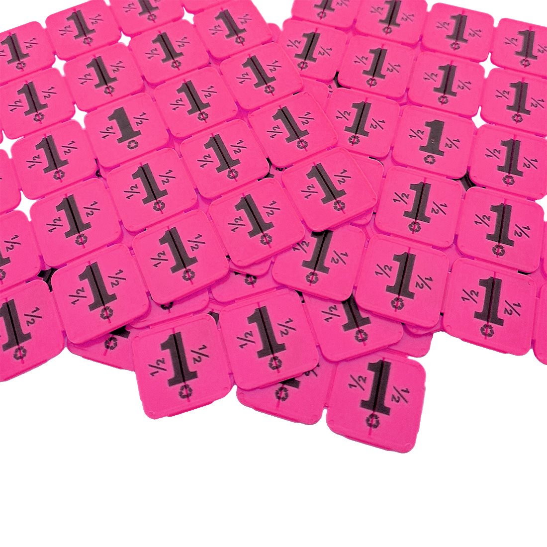 Break-off tokens made from recycled plastic, on sheets of 25 tokens each. Each token features the number 1 with two ½ symbols, meaning you can also use them as half tokens. Ideal for use at parties, festivals, and more. Sold in packs of 1000 tokens.