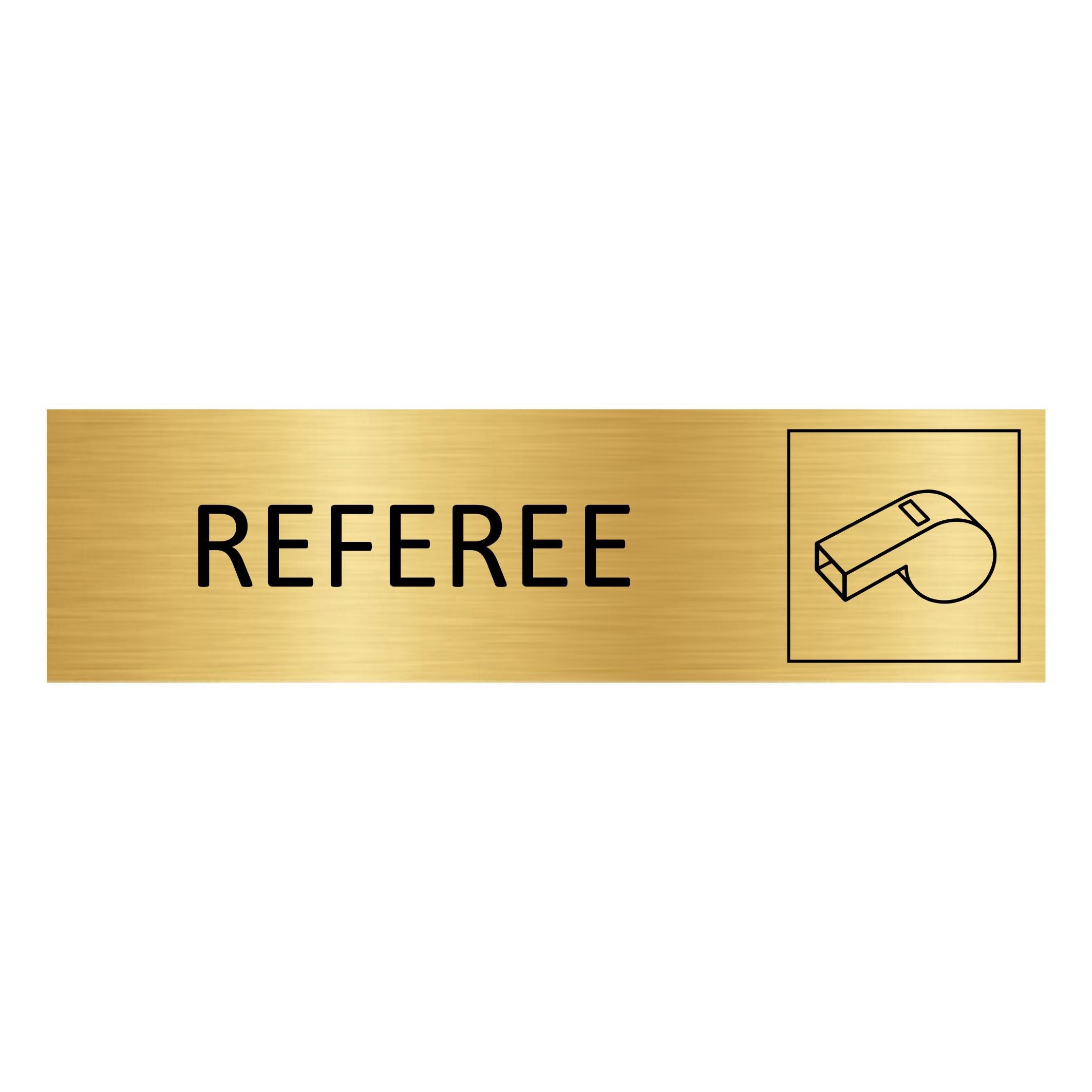 Gold-colored door sign featuring the text 'Referee', made of high quality aluminum. The sign measures 165 x 45 mm and has double-sided tape for easy mounting. Suitable for indoor and outdoor use. Sold individually.
