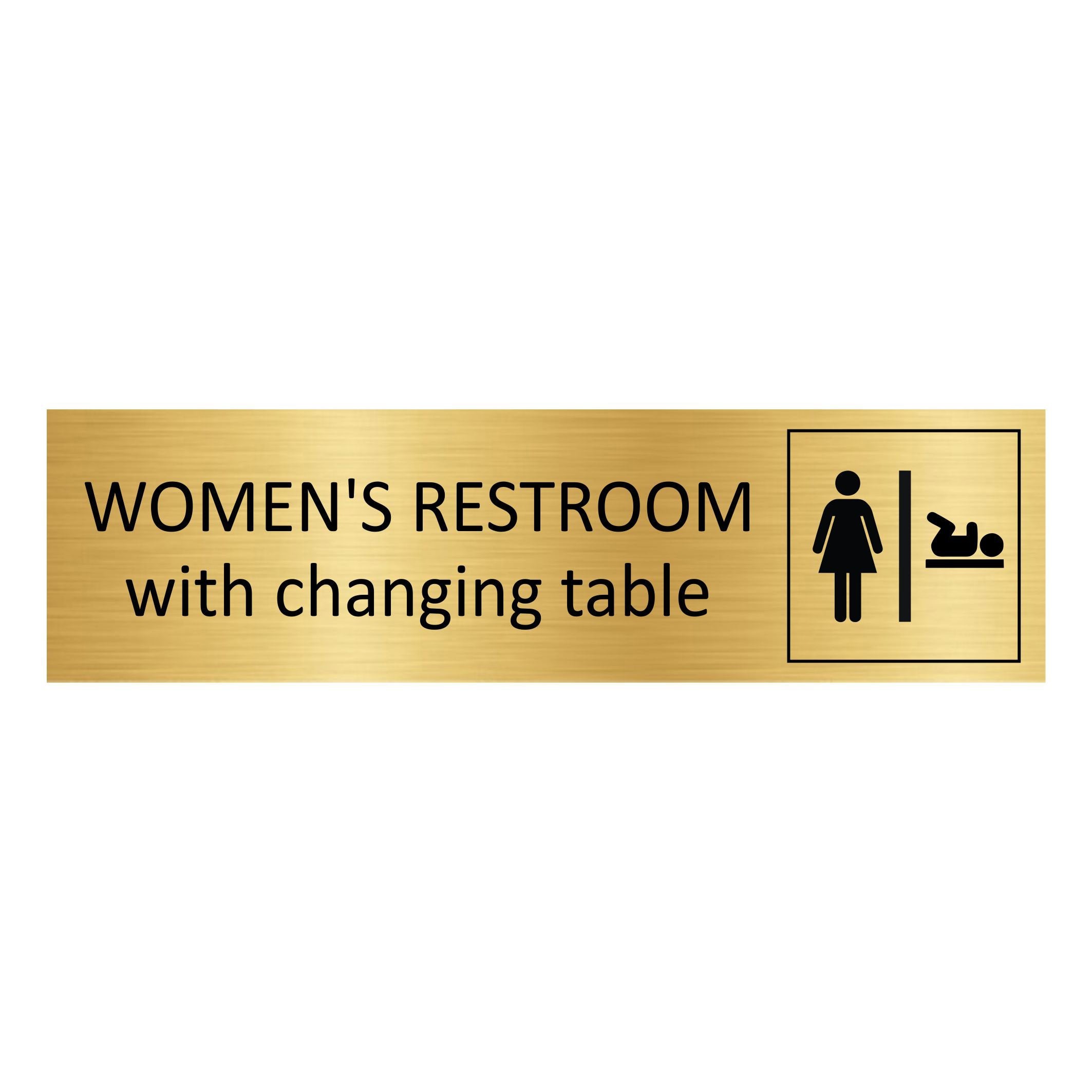 Gold-colored door sign for a women's restroom with changing table, made of high quality aluminum. The sign measures 165 x 45 mm and has double-sided tape for easy mounting. Suitable for indoor and outdoor use. Sold individually.