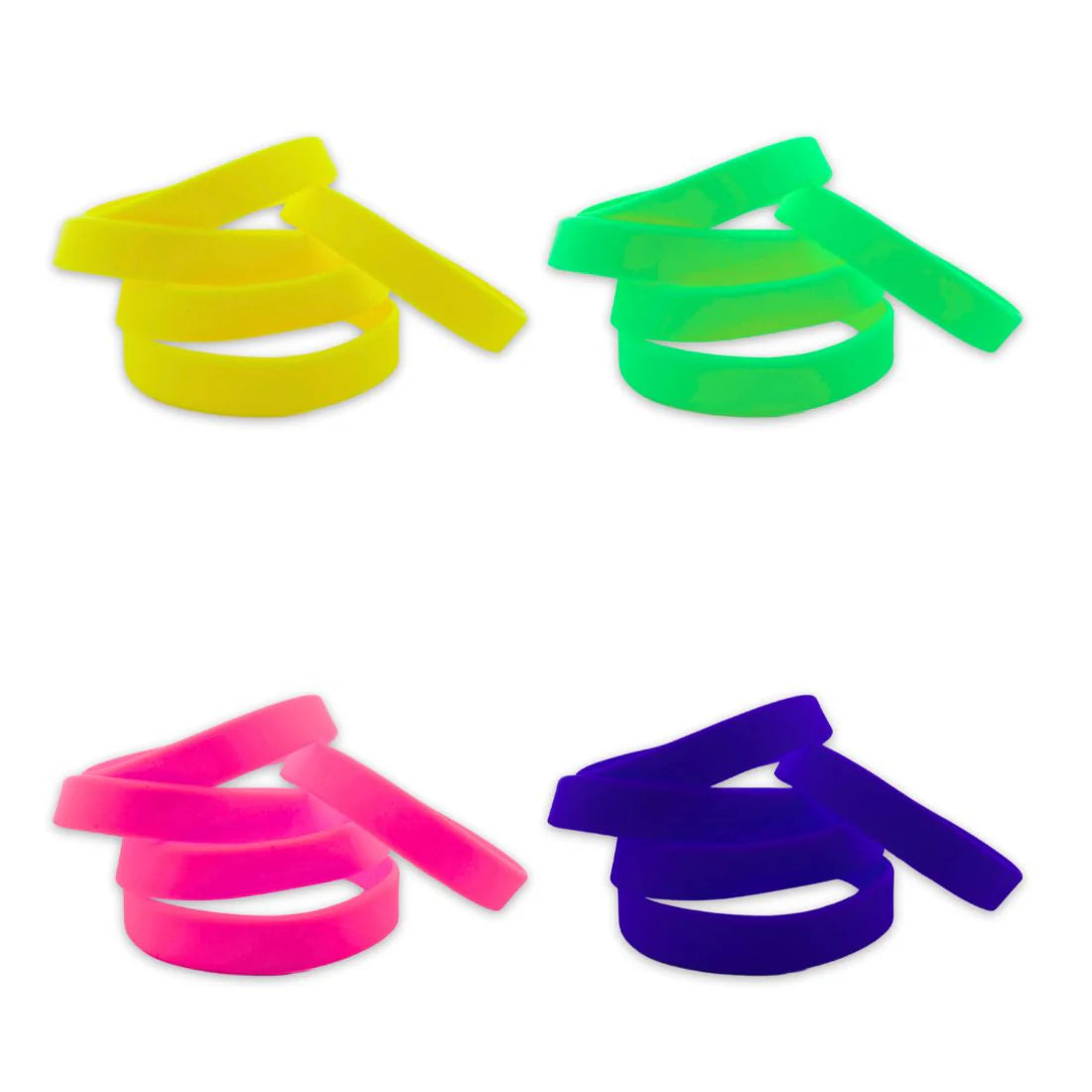Blank silicone wristbands for fundraisers, sports events, and other activities. These rubber bands are one-size-fits-all, so they’re suitable for both adults and children. They’re comfortable, water-resistant, and long-lasting. Available in 4 bright colors. Sold individually. Read more