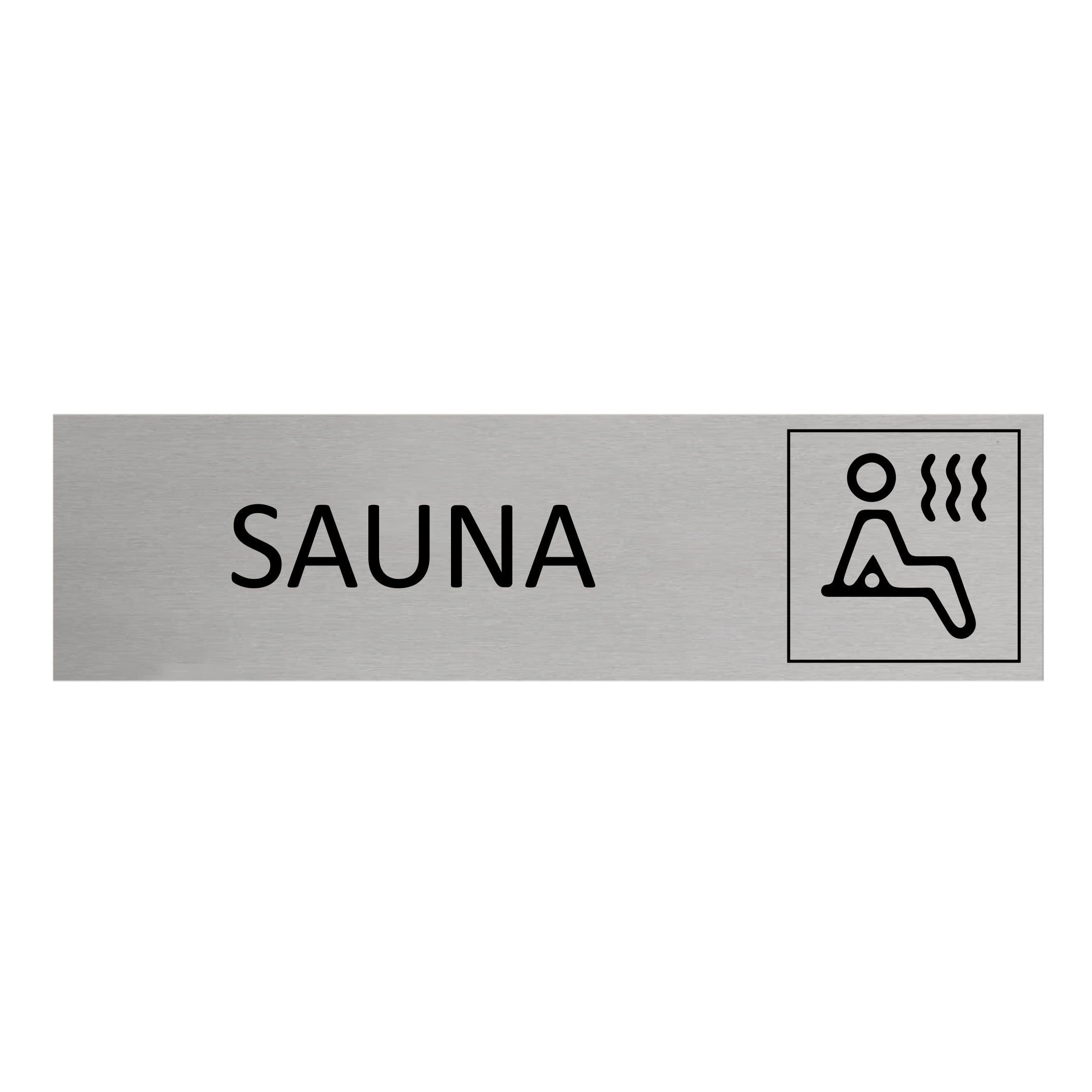 Door sign featuring the text 'Sauna', made of silver-colored aluminum. The sign measures 165 x 45 mm and has double-sided tape for easy mounting. Suitable for indoor and outdoor use. Sold individually. Read more