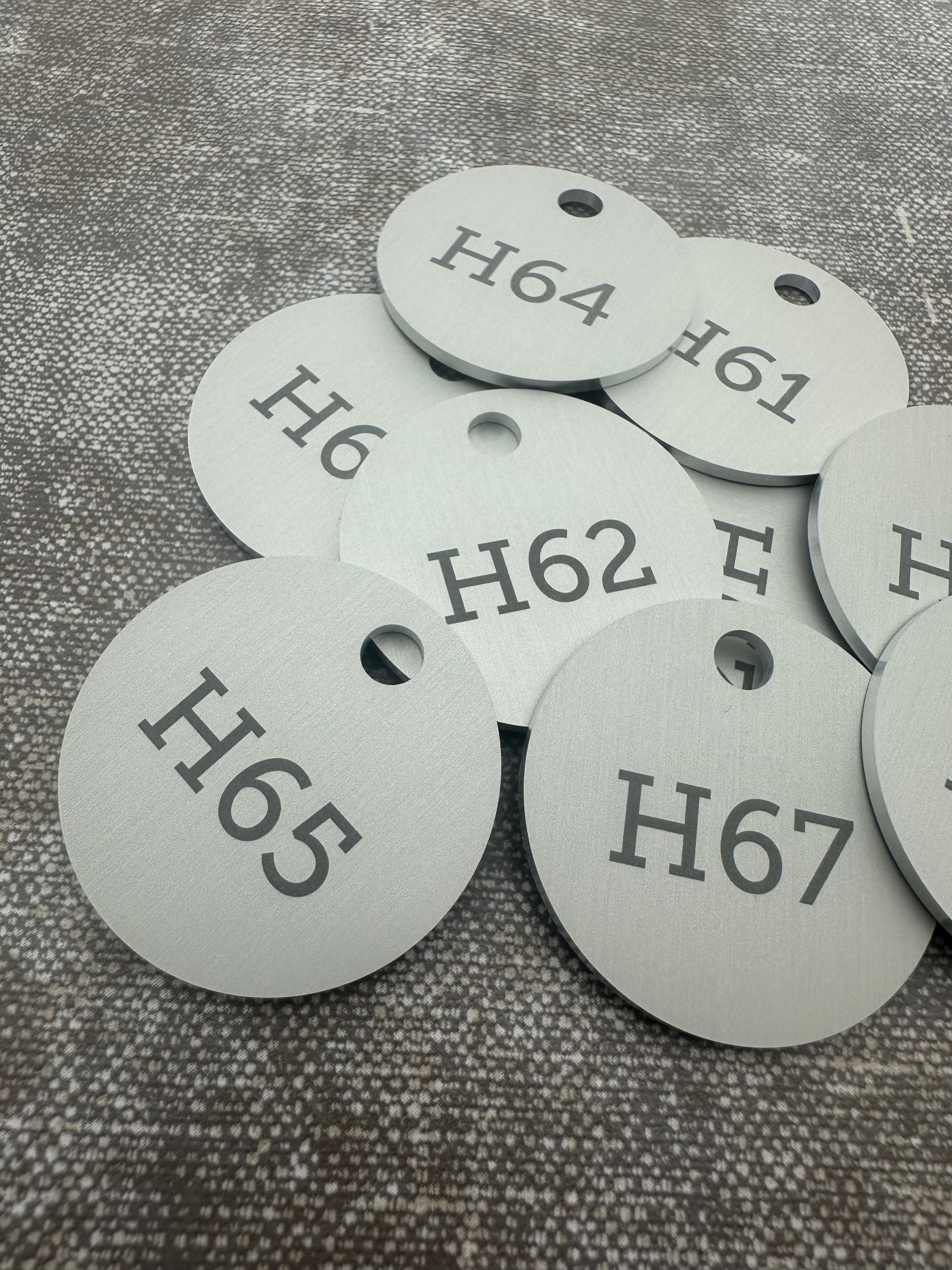 Personalize the aluminum key tag with your own numbering. Ideal for labeling your keys. The key tags are durable and available in 30 or 40 mm diameter. Choose from various thicknesses and attachment options. Sold individually.