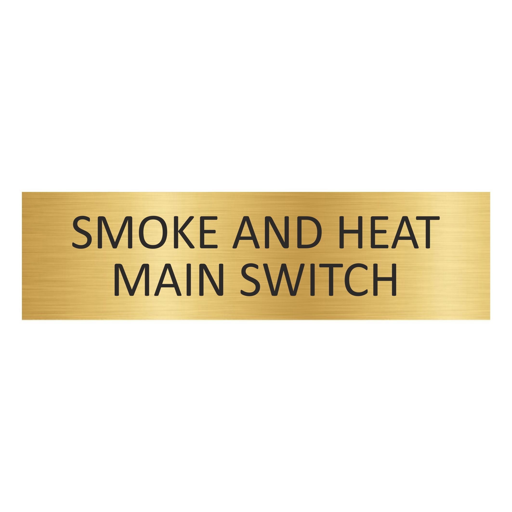 Gold-colored door sign featuring the text 'Smoke and heat main switch', made of high quality aluminum. The sign measures 165 x 45 mm and has double-sided tape for easy mounting. Suitable for indoor and outdoor use. Sold individually. Read more