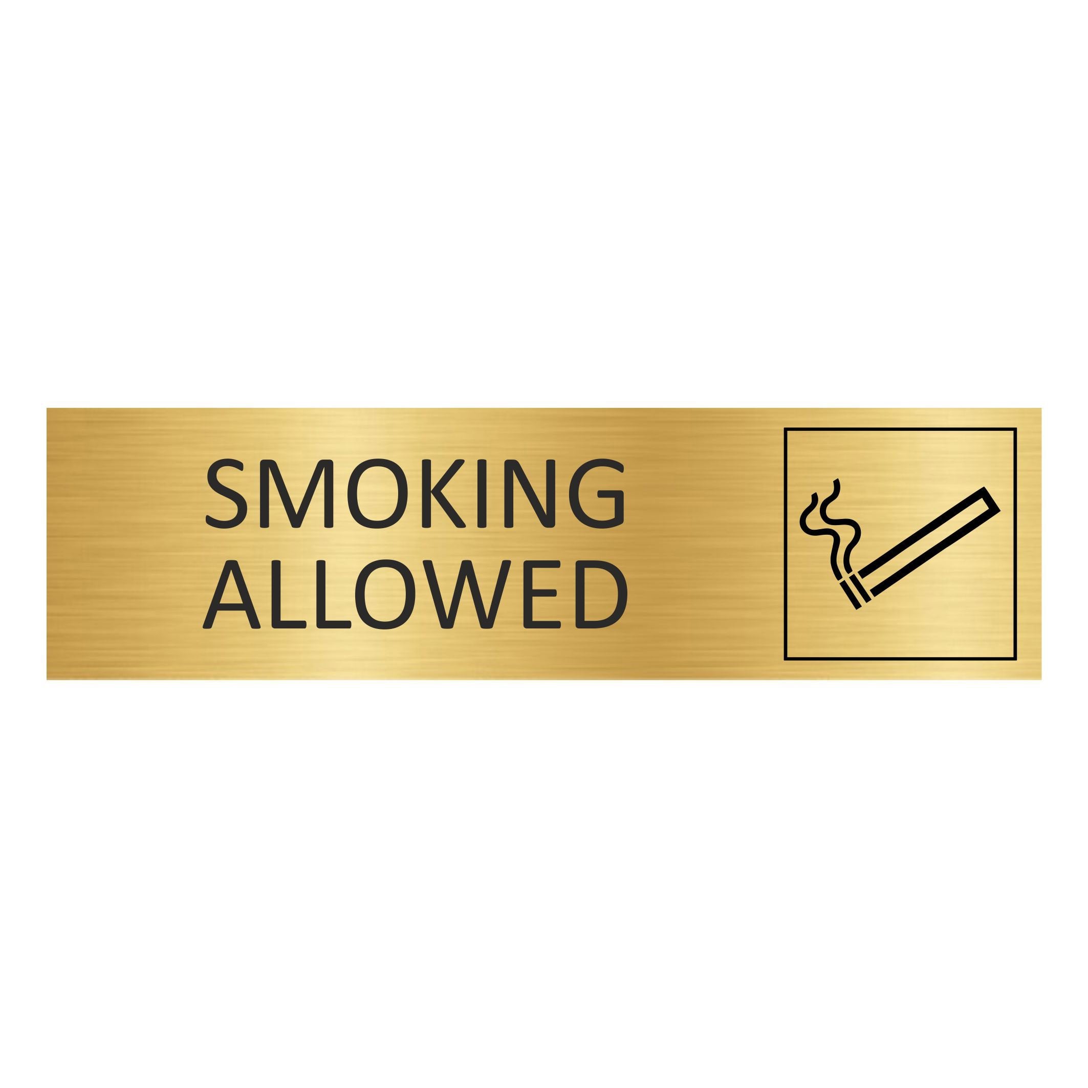 Gold-colored door sign featuring the text 'Smoking allowed', made of high quality aluminum. The sign measures 165 x 45 mm and has double-sided tape for easy mounting. Suitable for indoor and outdoor use. Sold individually. Read more