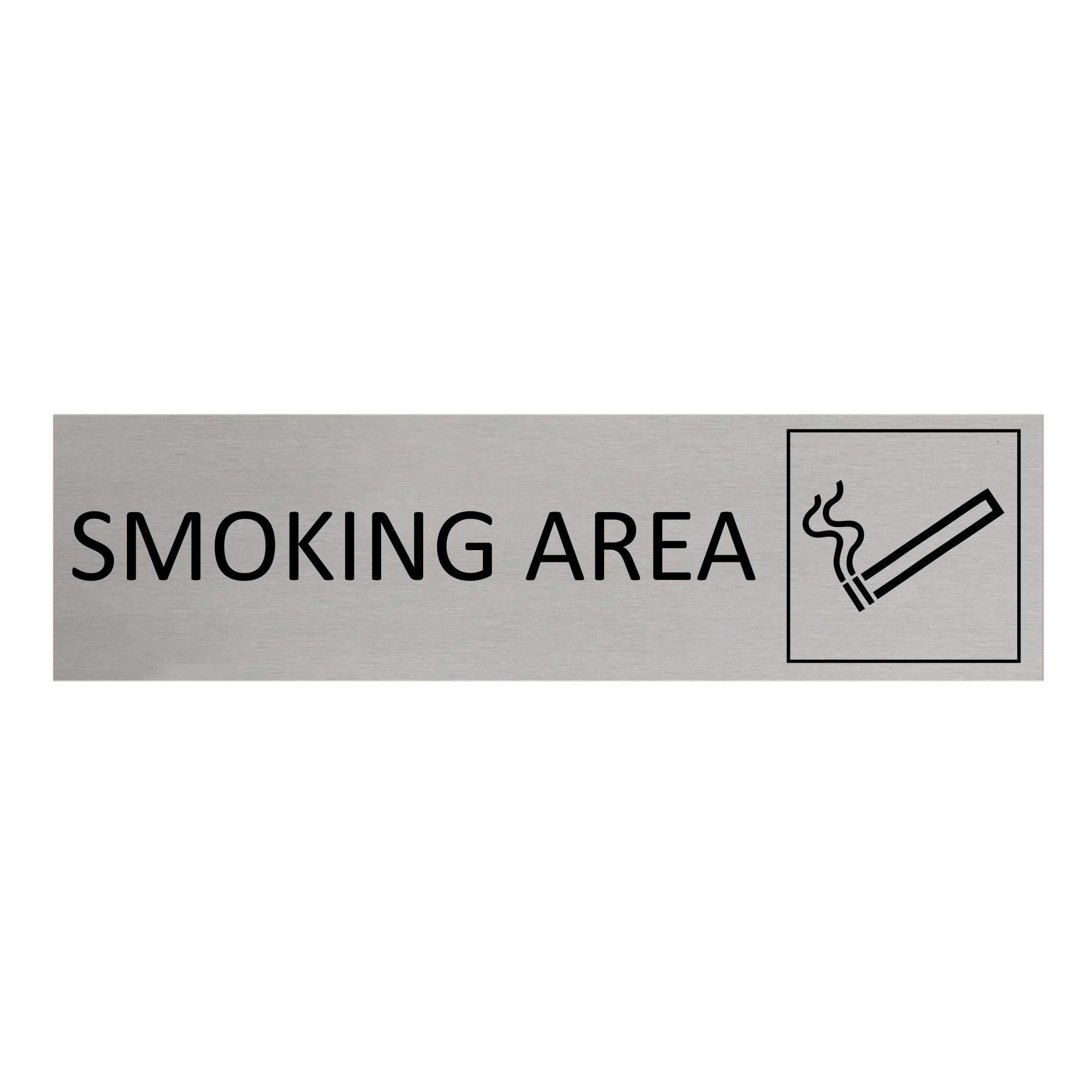 Door sign featuring the text 'Smoking area', made of silver-colored aluminum. The sign measures 165 x 45 mm and has double-sided tape for easy mounting. Suitable for indoor and outdoor use. Sold individually. Read more