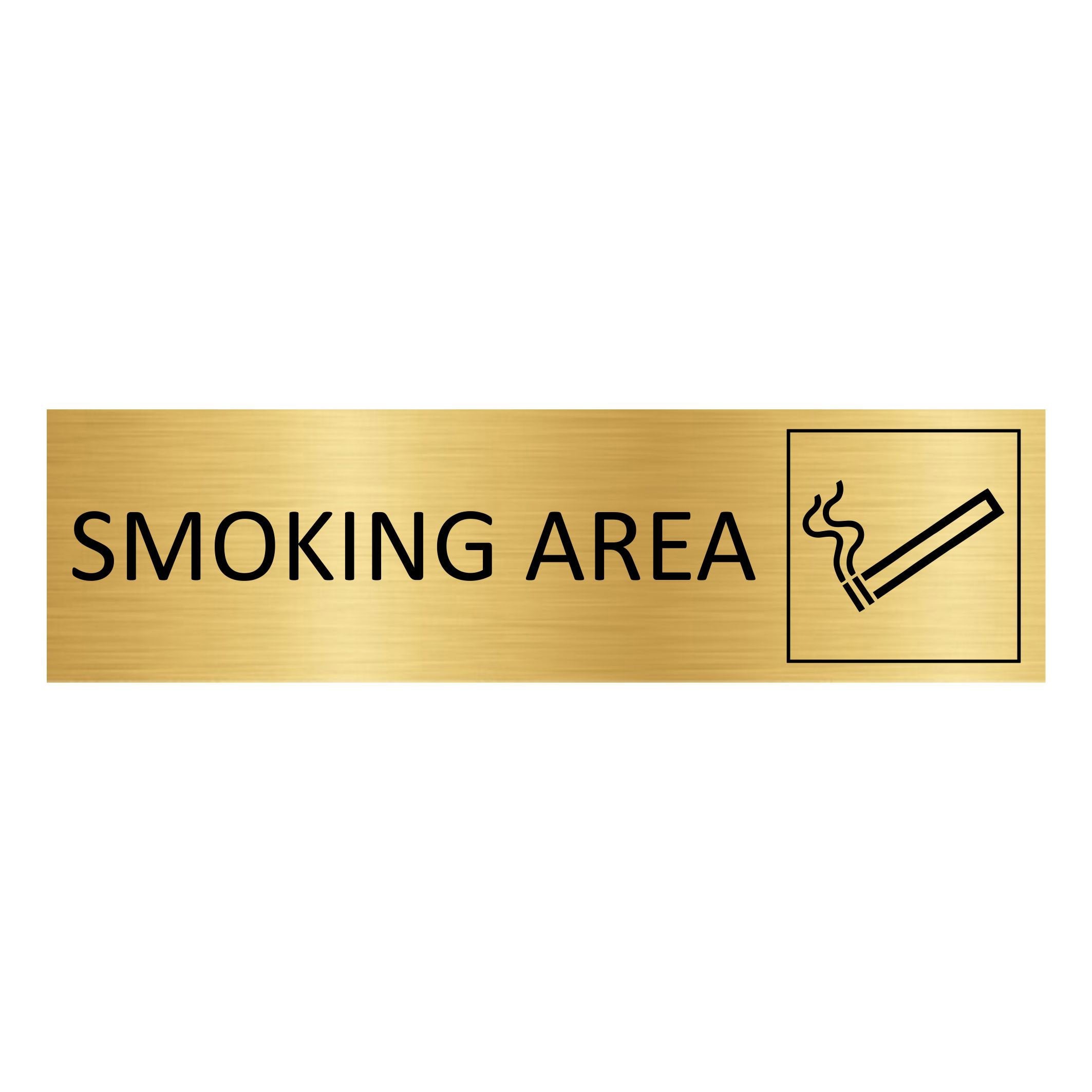 Gold-colored door sign featuring the text 'Smoking area', made of high quality aluminum. The sign measures 165 x 45 mm and has double-sided tape for easy mounting. Suitable for indoor and outdoor use. Sold individually.