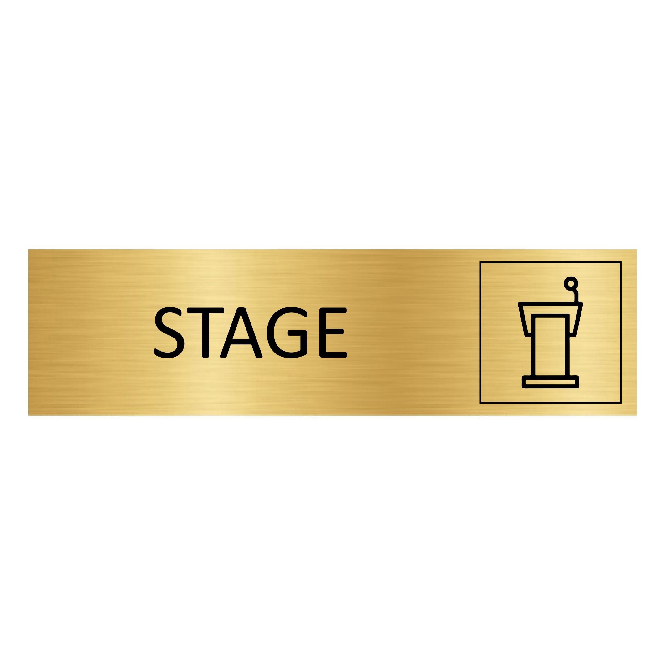 Gold-colored door sign featuring the text 'Stage', made of high quality aluminum. The sign measures 165 x 45 mm and has double-sided tape for easy mounting. Suitable for indoor and outdoor use. Sold individually.