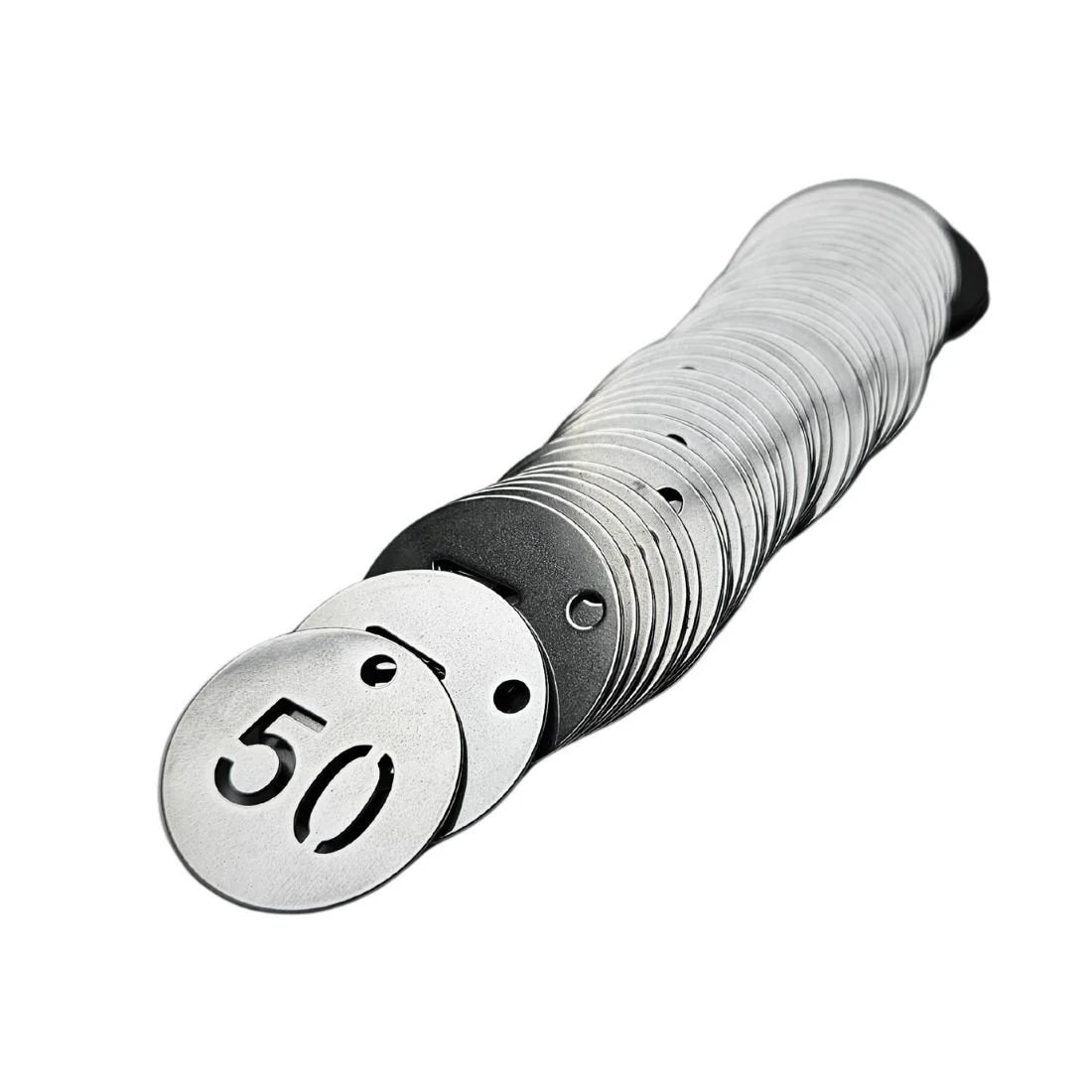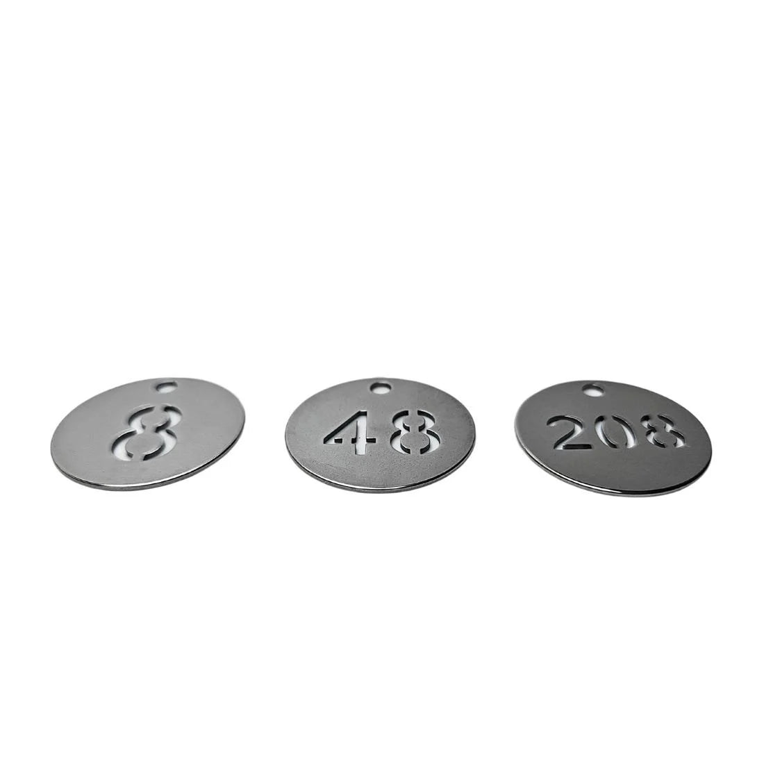 Practical sets of key tags with cut-out numbers. These stainless steel tags stay readable in many conditions. Each tag is 30 mm round and 1 mm thick. Choose from different number ranges. Read more