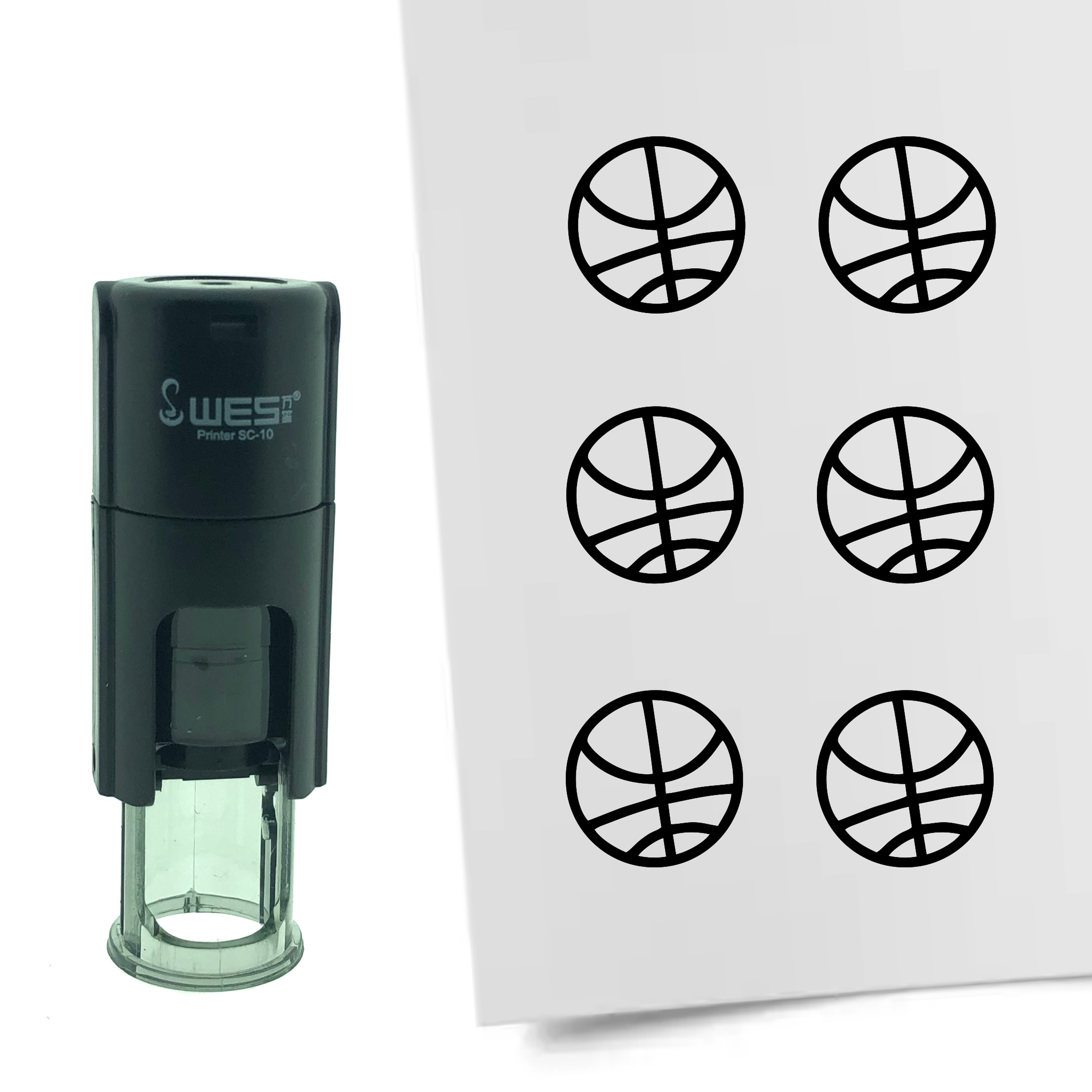 Mini stamp with a 10 mm round print of a basketball in 6 colors. The stamp can be used for stamping loyalty cards, punch cards, bullet journals, planners, and more. It has a refillable ink pad.