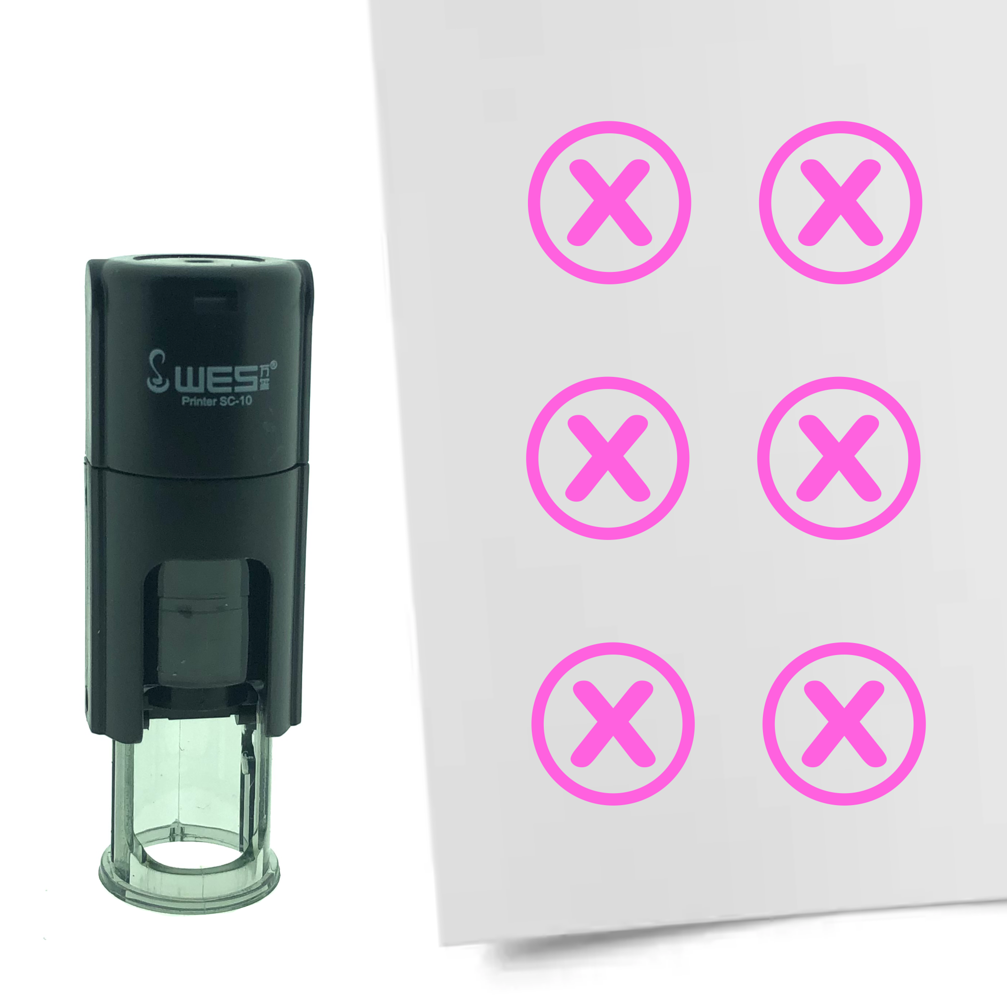 Mini stamp with a 10 mm round print of a checkbox with X in 6 colors. The stamp can be used for stamping loyalty cards, punch cards, bullet journals, planners, and more. It has a refillable ink pad.