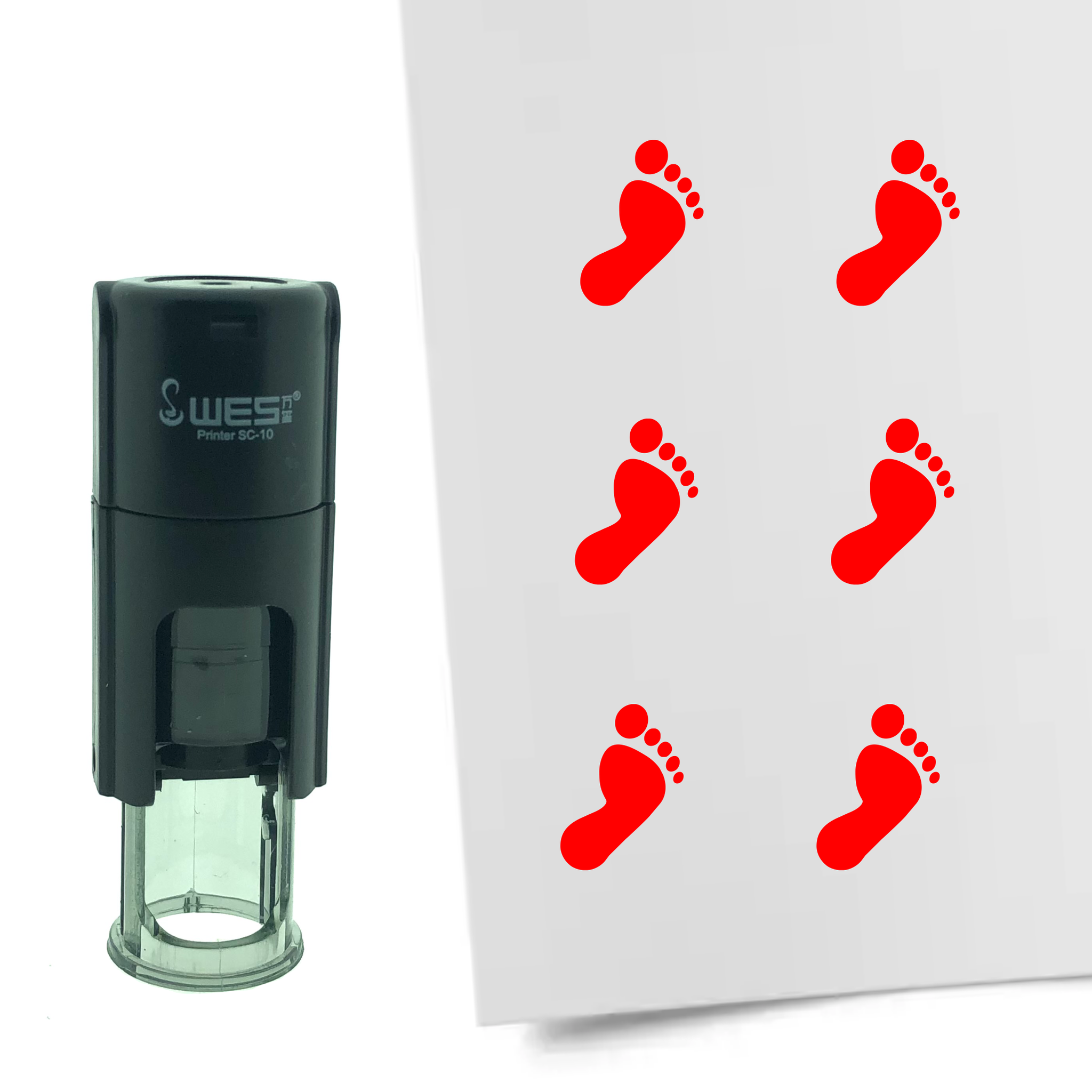 Mini stamp with a 10 mm round print of a foot in 6 colors. The stamp can be used for stamping loyalty cards, punch cards, bullet journals, planners, and more. It has a refillable ink pad.