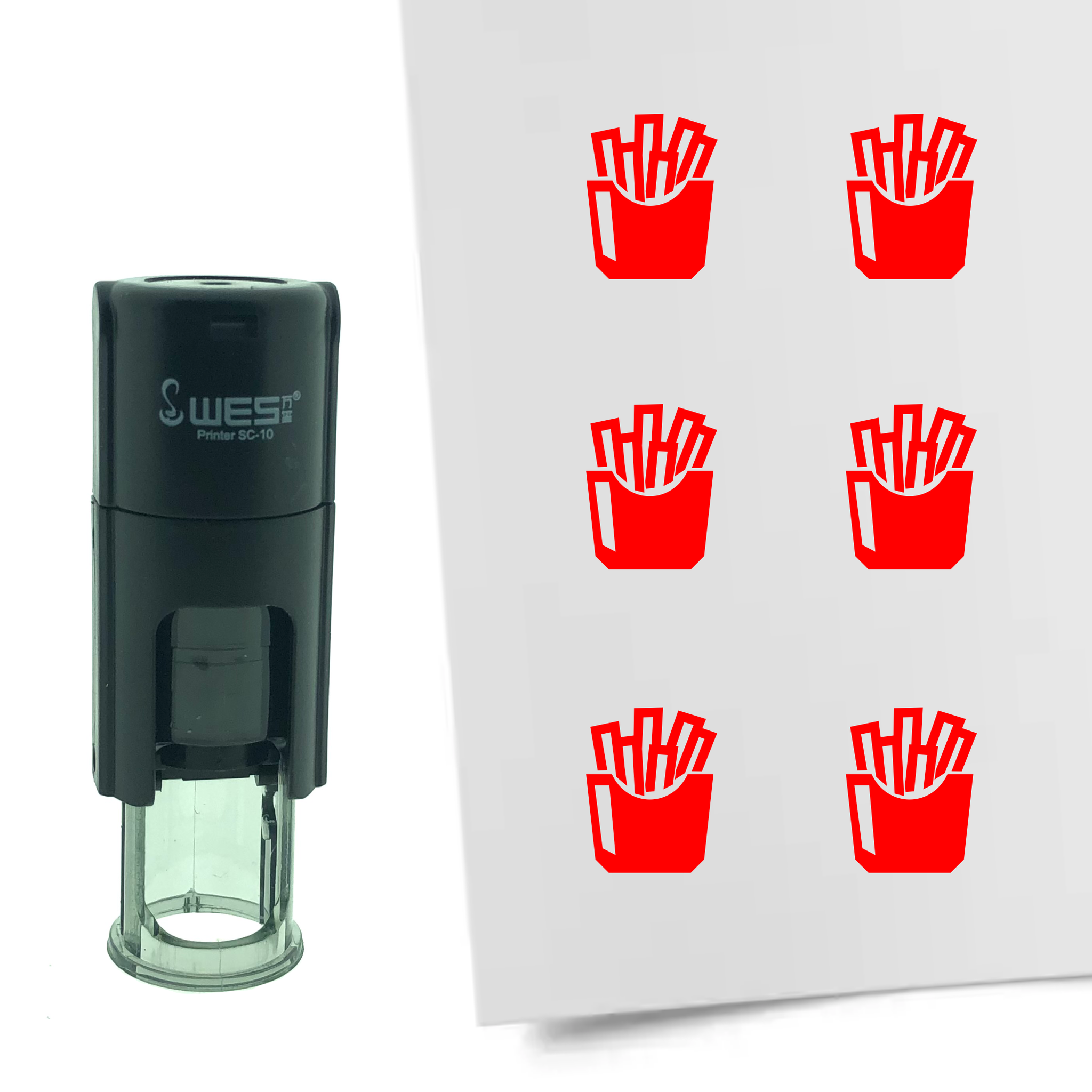 Mini stamp with a 10 mm round print of fries in 6 colors. The stamp can be used for stamping loyalty cards, punch cards, bullet journals, planners, and more. It has a refillable ink pad. Read more