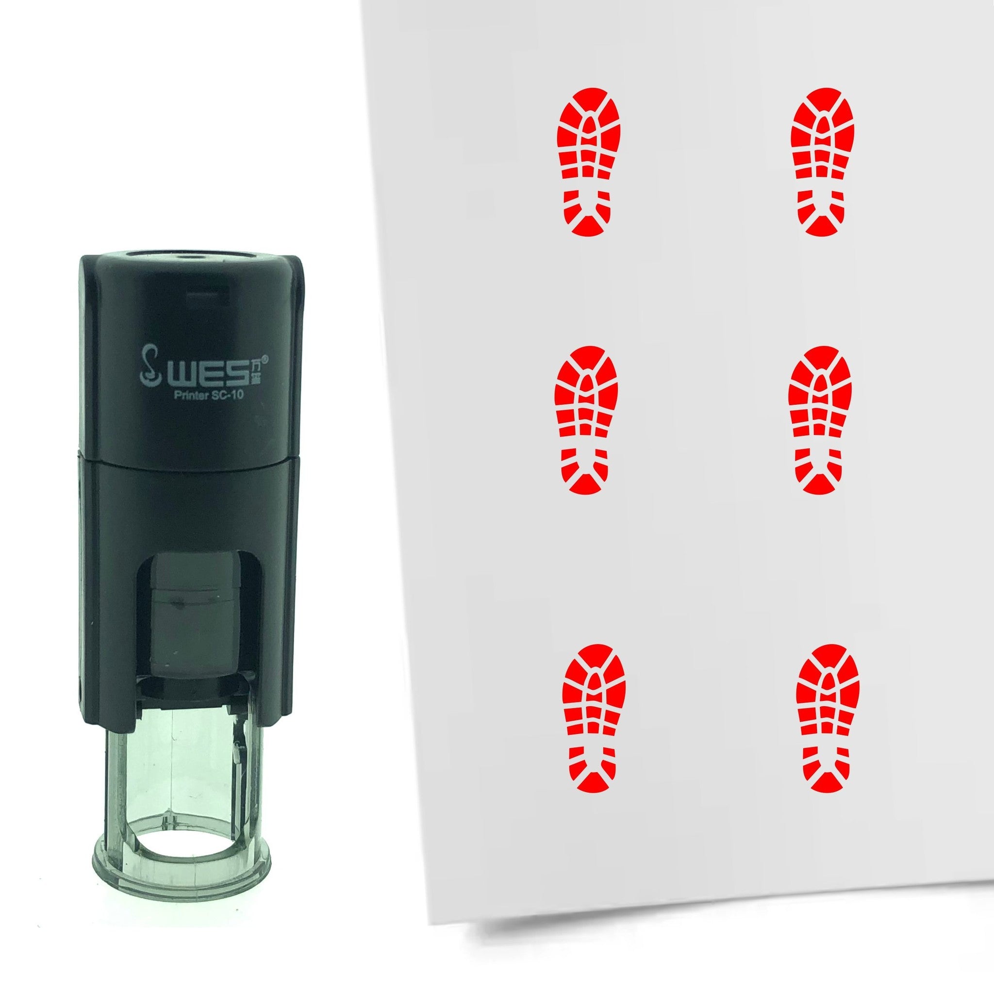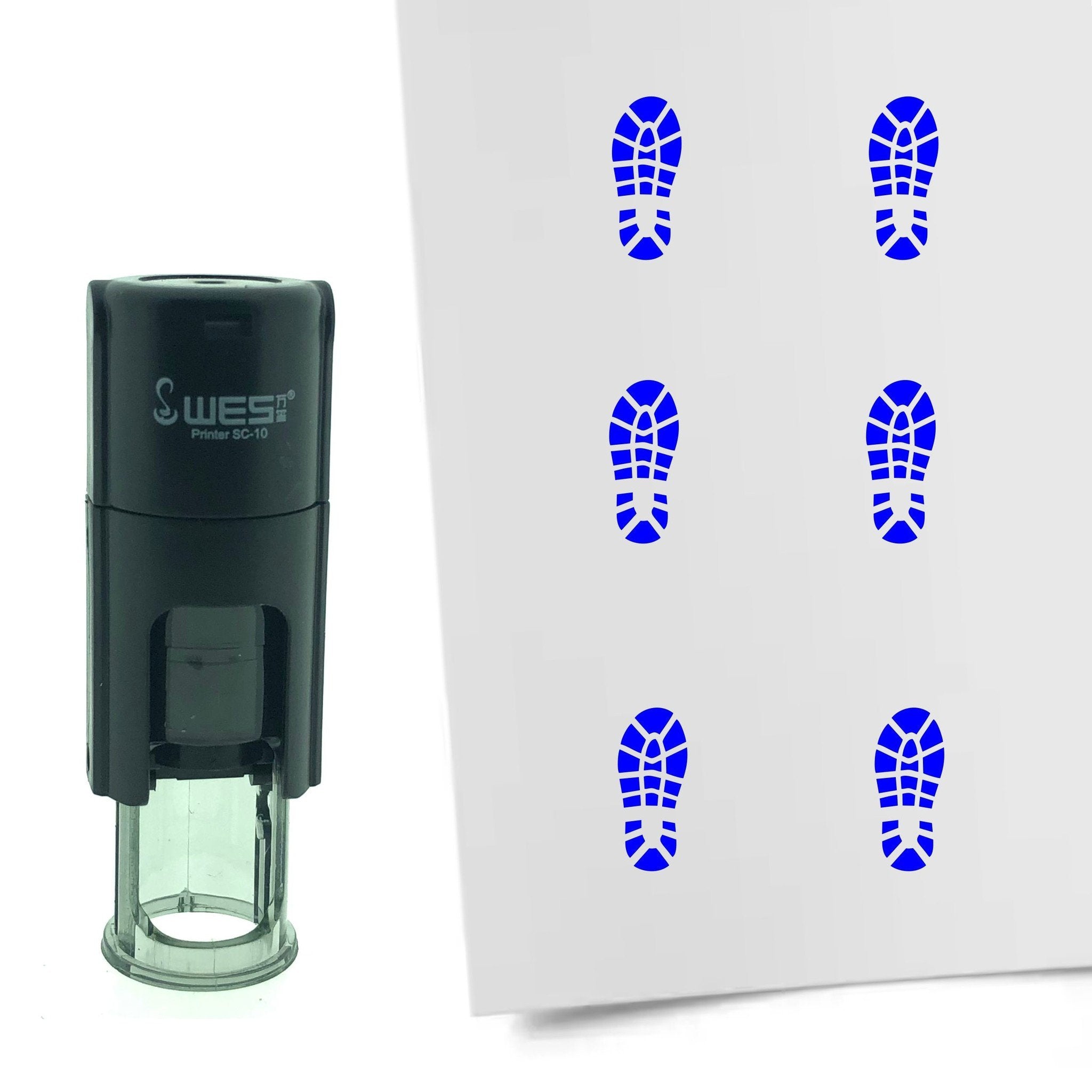 Mini stamp with a 10 mm round print of a shoe print in 6 colors. The stamp can be used for stamping loyalty cards, punch cards, bullet journals, planners, and more. It has a refillable ink pad.