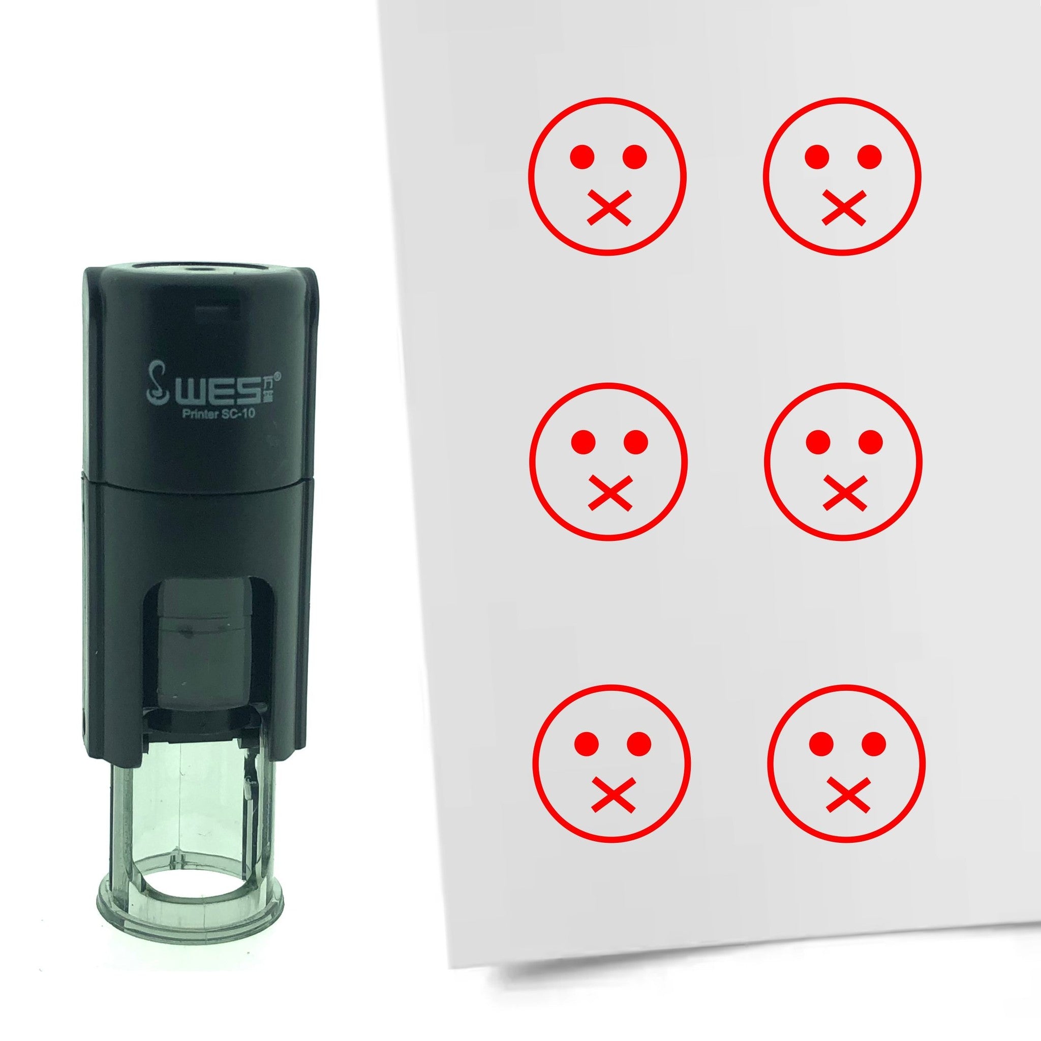 Mini stamp with a 10 mm round print of a smiley with closed mouth in 6 colors. The stamp can be used for stamping loyalty cards, punch cards, bullet journals, planners, and more. It has a refillable ink pad. Read more