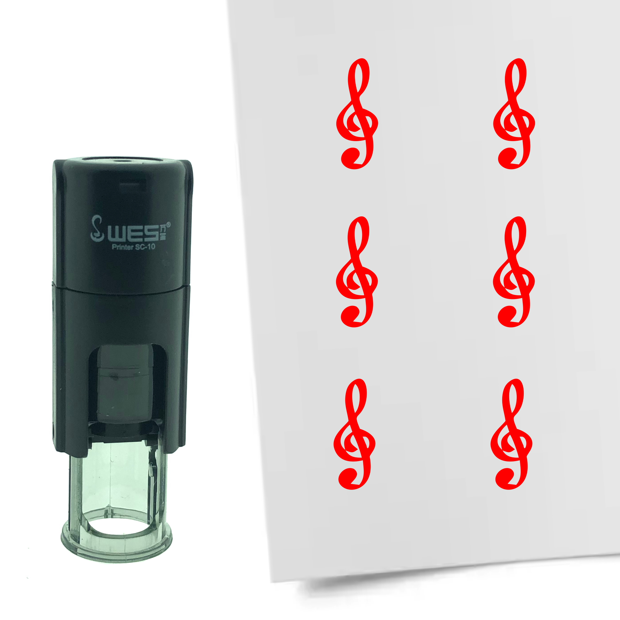 Mini stamp with a 10 mm round print of a treble clef in 6 colors. The stamp can be used for stamping loyalty cards, punch cards, bullet journals, planners, and more. It has a refillable ink pad.