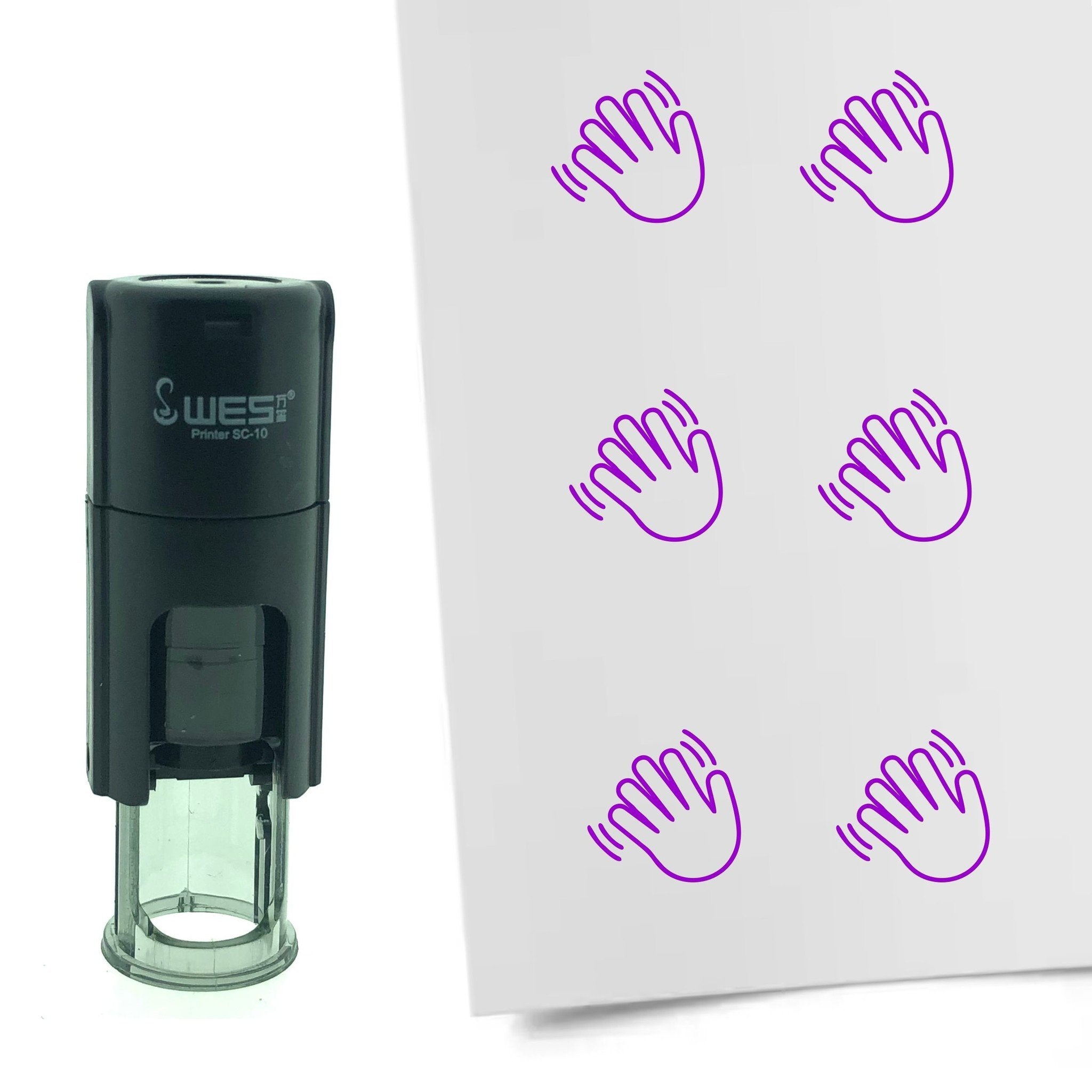 Mini stamp with a 10 mm round print of waving hands in 6 colors. The stamp can be used for stamping loyalty cards, punch cards, bullet journals, planners, and more. It has a refillable ink pad. Read more