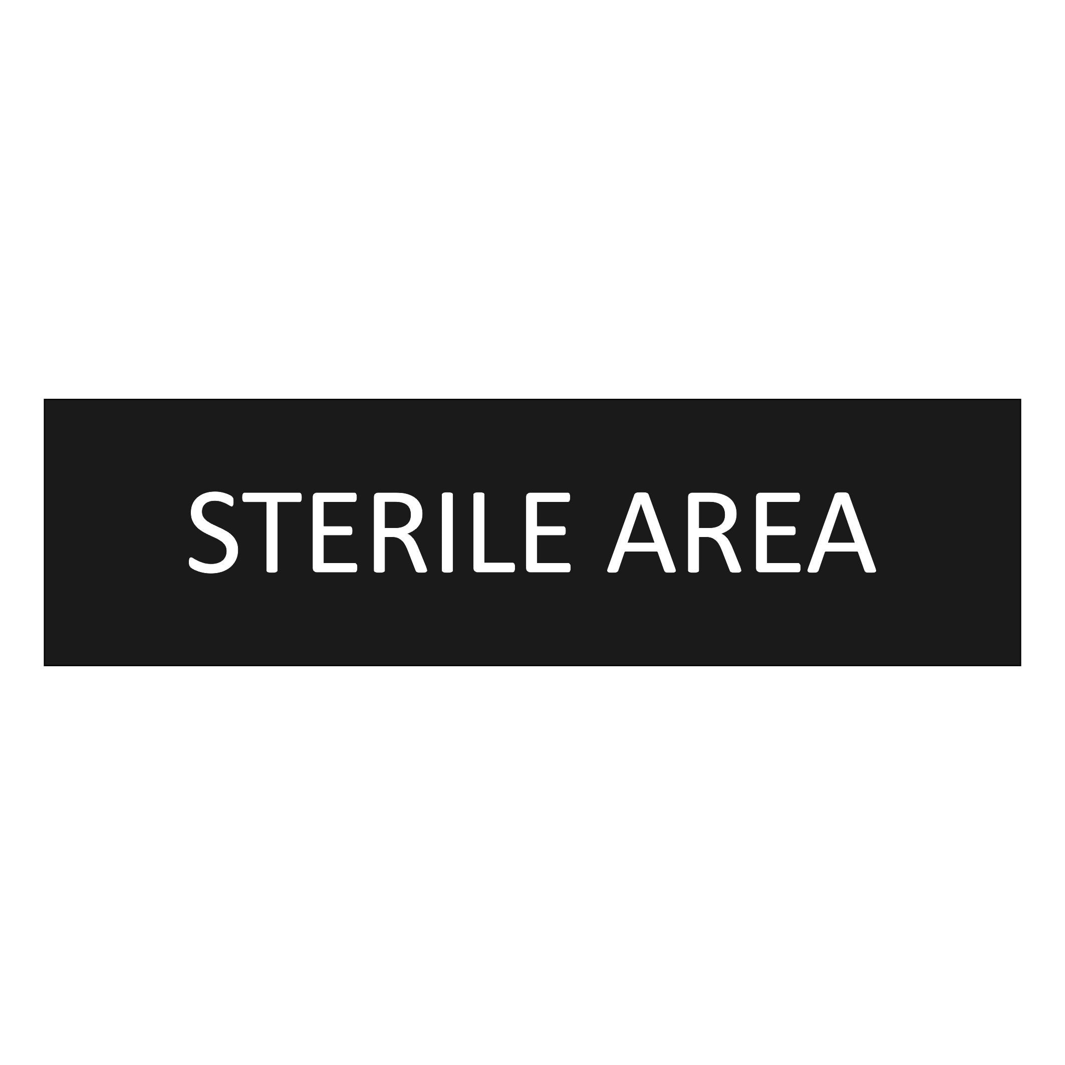 Black door sign featuring the text 'Sterile area', made of high quality aluminum. The sign measures 165 x 45 mm and has double-sided tape for easy mounting. Suitable for indoor and outdoor use. Sold individually.