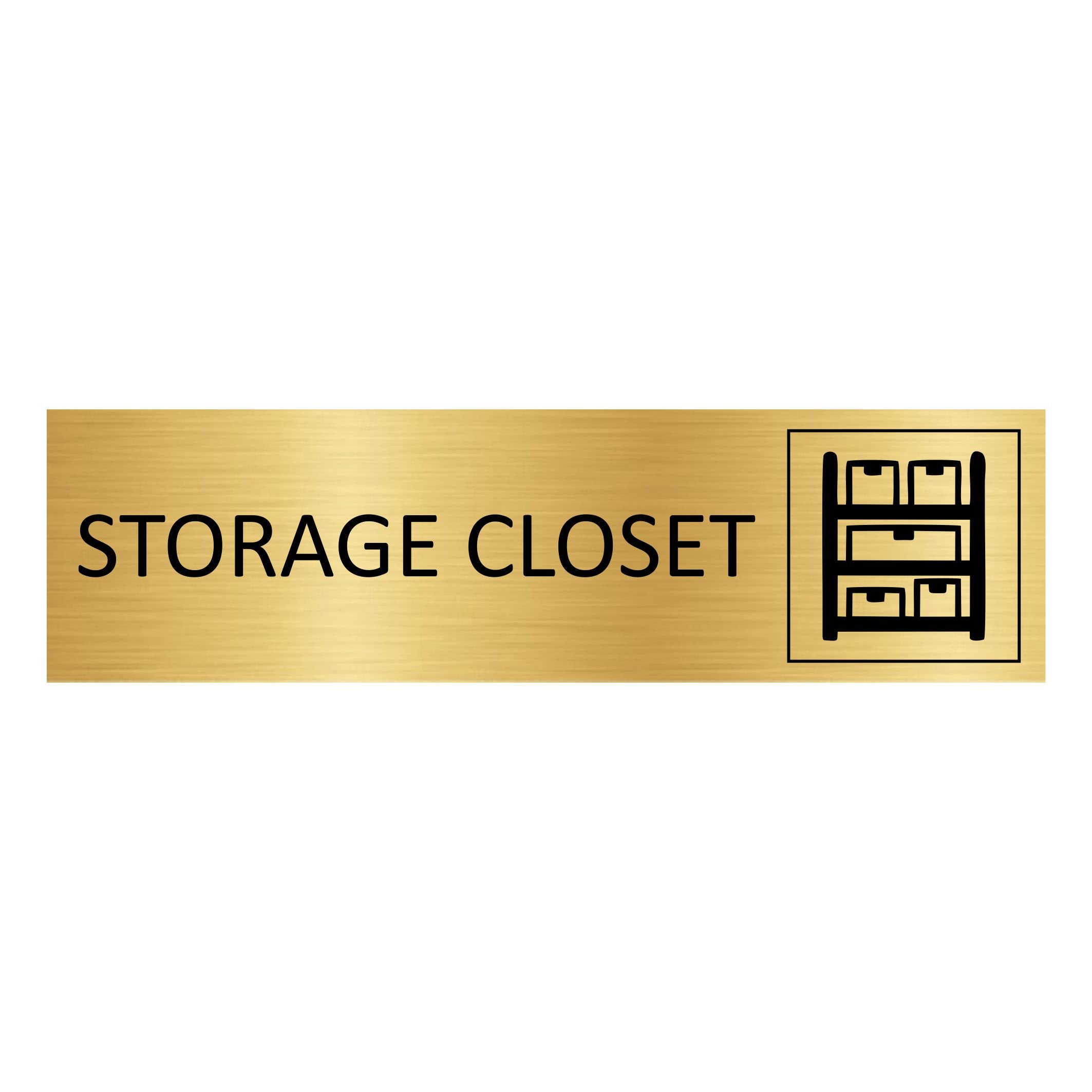 Gold-colored door sign featuring the text 'Storage closet', made of high quality aluminum. The sign measures 165 x 45 mm and has double-sided tape for easy mounting. Suitable for indoor and outdoor use. Sold individually. Read more