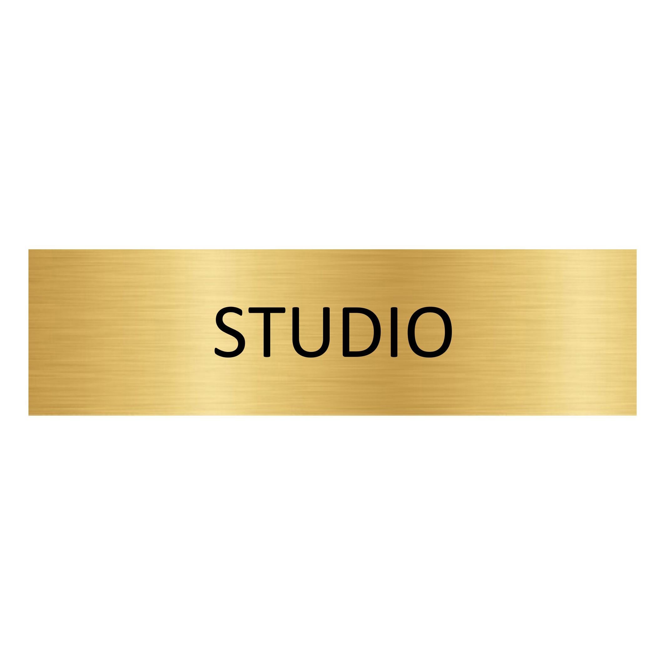 Gold-colored door sign featuring the text 'Studio', made of high quality aluminum. The sign measures 165 x 45 mm and has double-sided tape for easy mounting. Suitable for indoor and outdoor use. Sold individually.