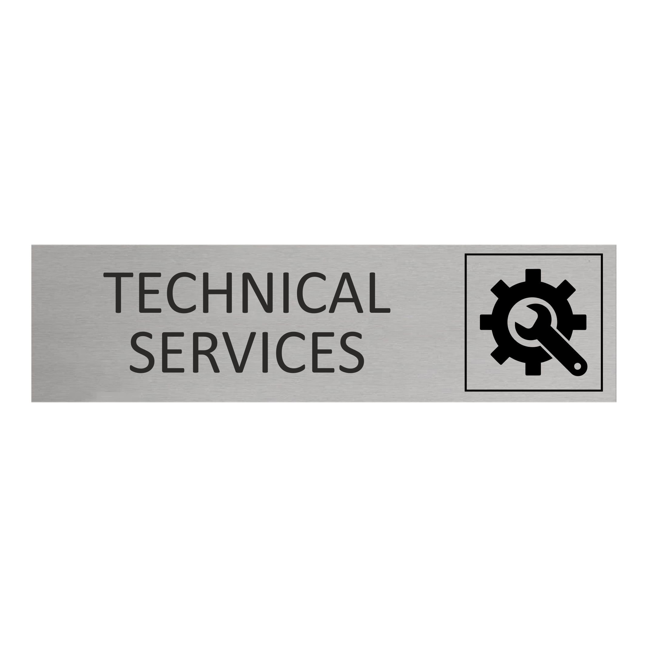 Door sign featuring the text 'Technical services', made of silver-colored aluminum. The sign measures 165 x 45 mm and has double-sided tape for easy mounting. Suitable for indoor and outdoor use. Sold individually.