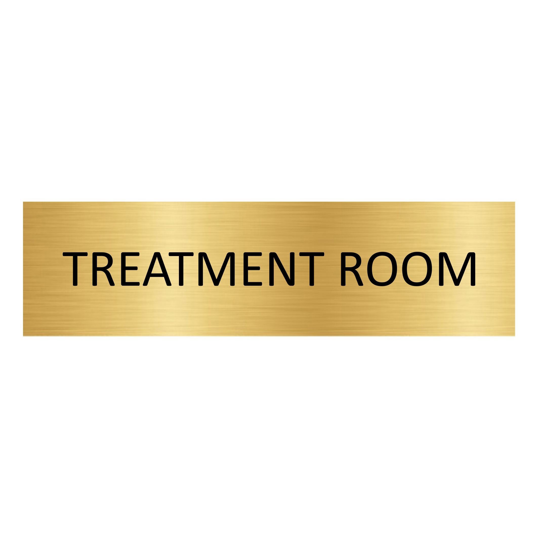 Gold-colored door sign featuring the text 'Treatment room', made of high quality aluminum. The sign measures 165 x 45 mm and has double-sided tape for easy mounting. Suitable for indoor and outdoor use. Sold individually.