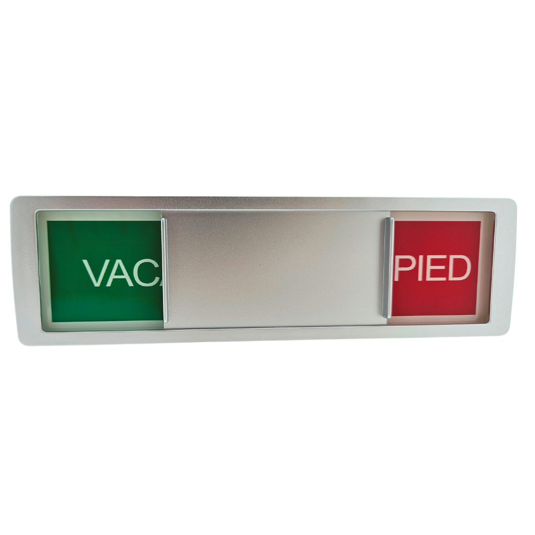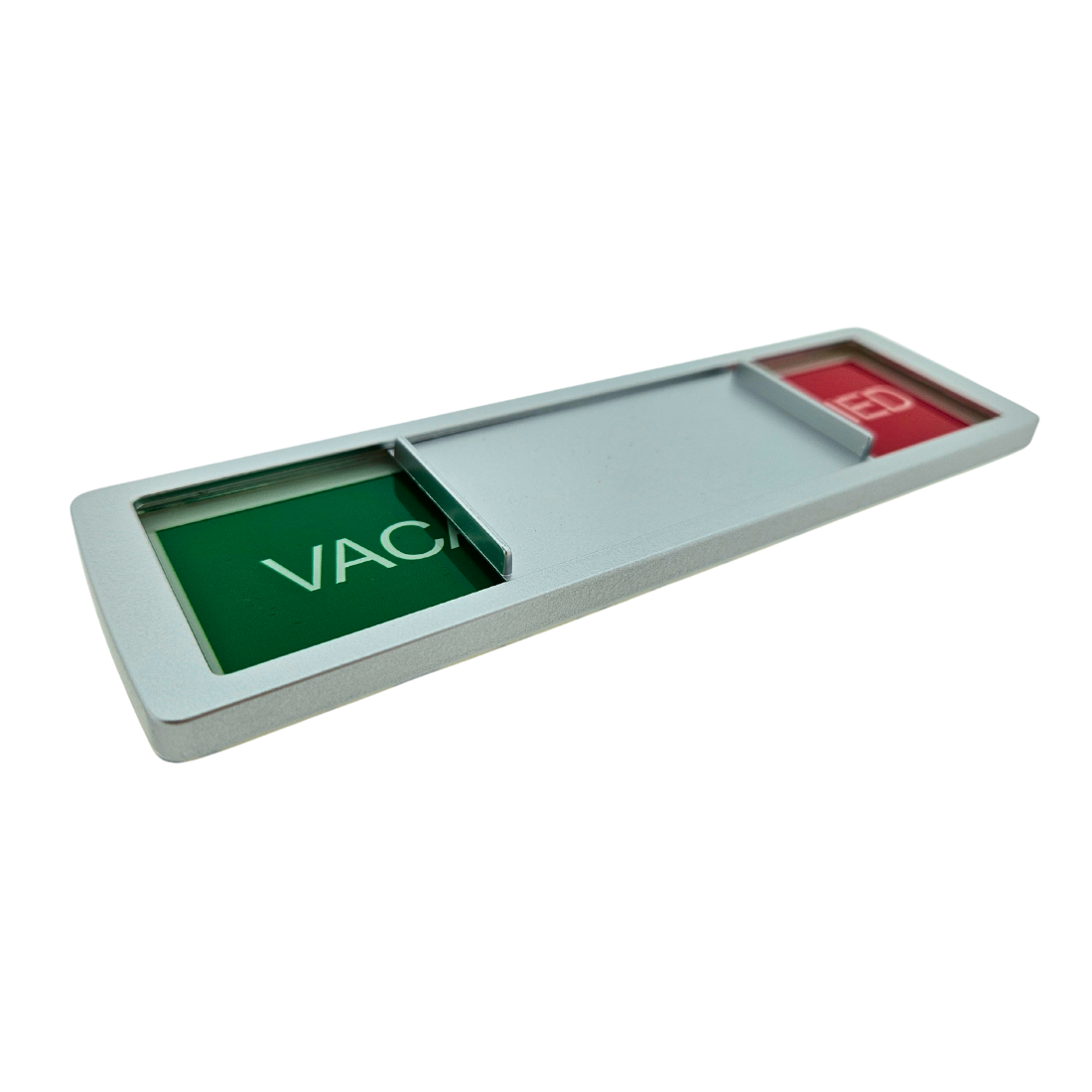 A plastic slider sign with a movable panel to show whether a room is vacant or occupied. Comes with 3M adhesive tape on the back for easy mounting. Size: 178 x 50 x 8 mm. Available in silver or black.