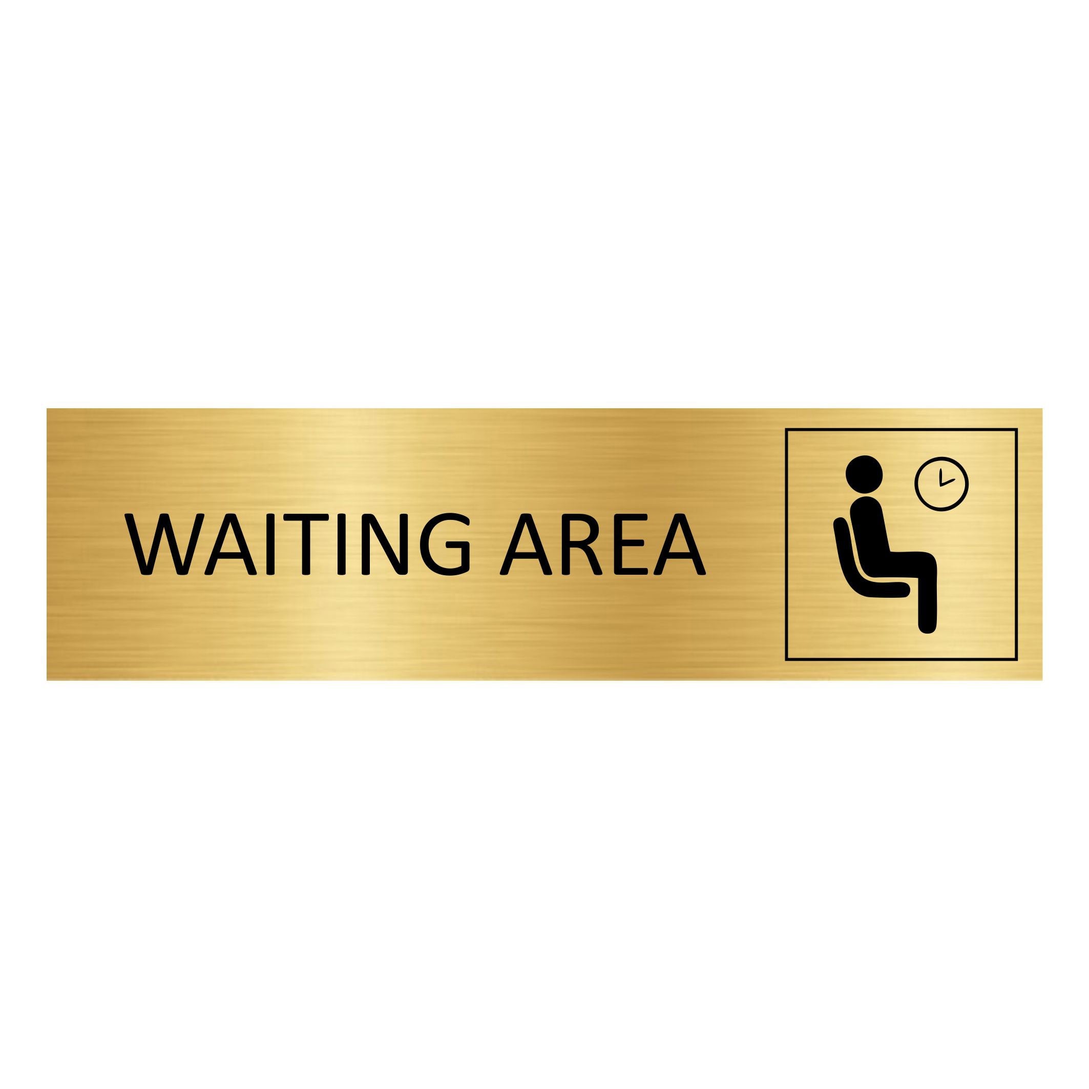 Gold-colored door sign featuring the text 'Waiting area', made of high quality aluminum. The sign measures 165 x 45 mm and has double-sided tape for easy mounting. Suitable for indoor and outdoor use. Sold individually.