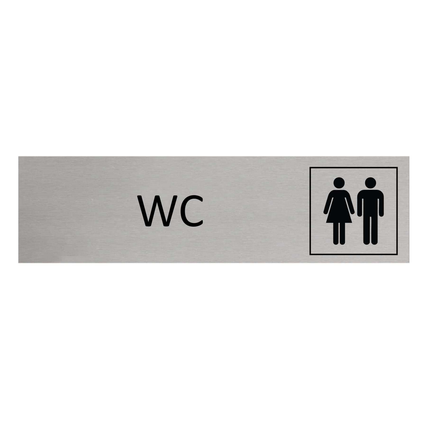 Door sign featuring the text 'WC', made of silver-colored aluminum. The sign measures 165 x 45 mm and has double-sided tape for easy mounting. Suitable for indoor and outdoor use. Sold individually.
