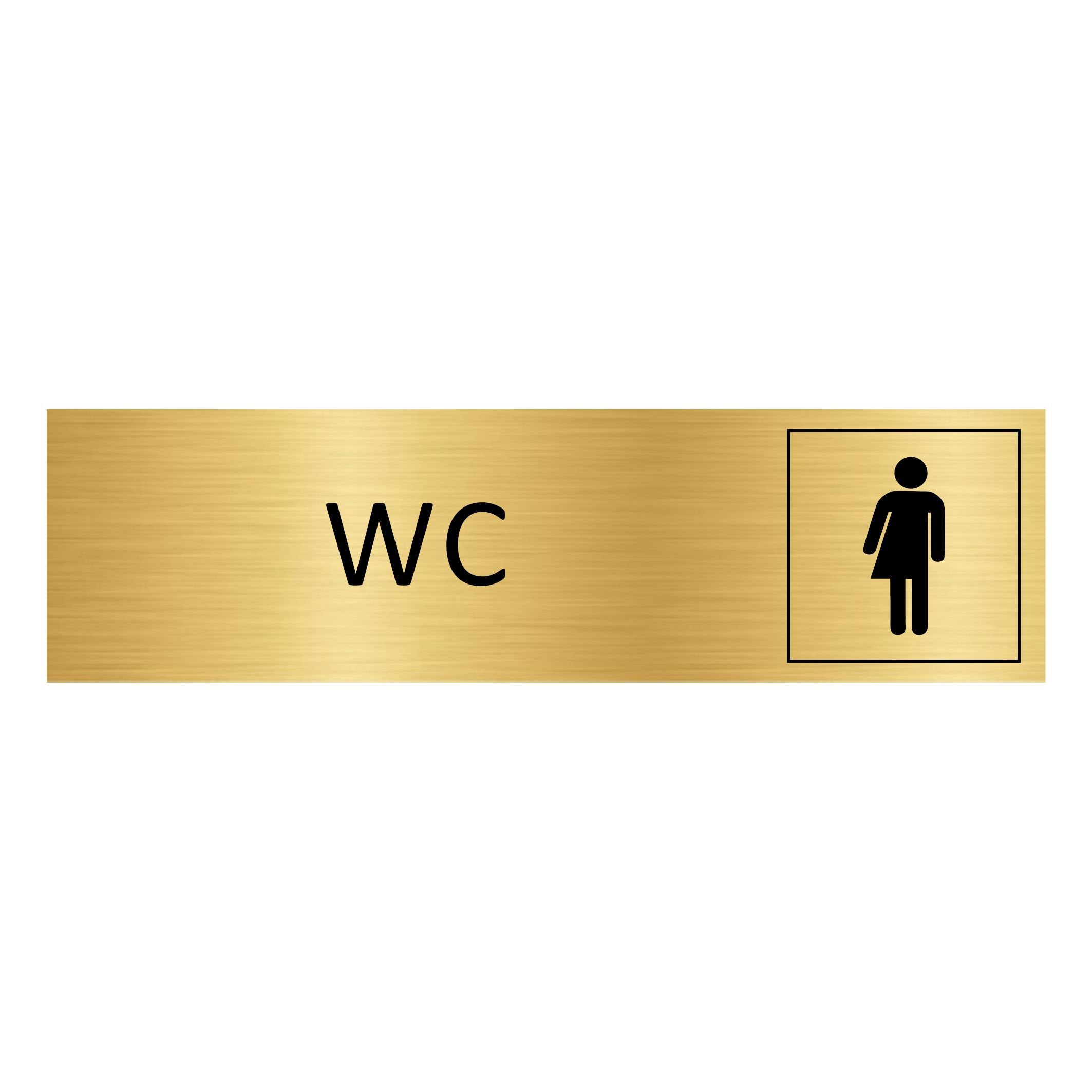 Gold-colored gender neutral door sign featuring the text 'WC', made of high quality aluminum. The sign measures 165 x 45 mm and has double-sided tape for easy mounting. Suitable for indoor and outdoor use. Sold individually.