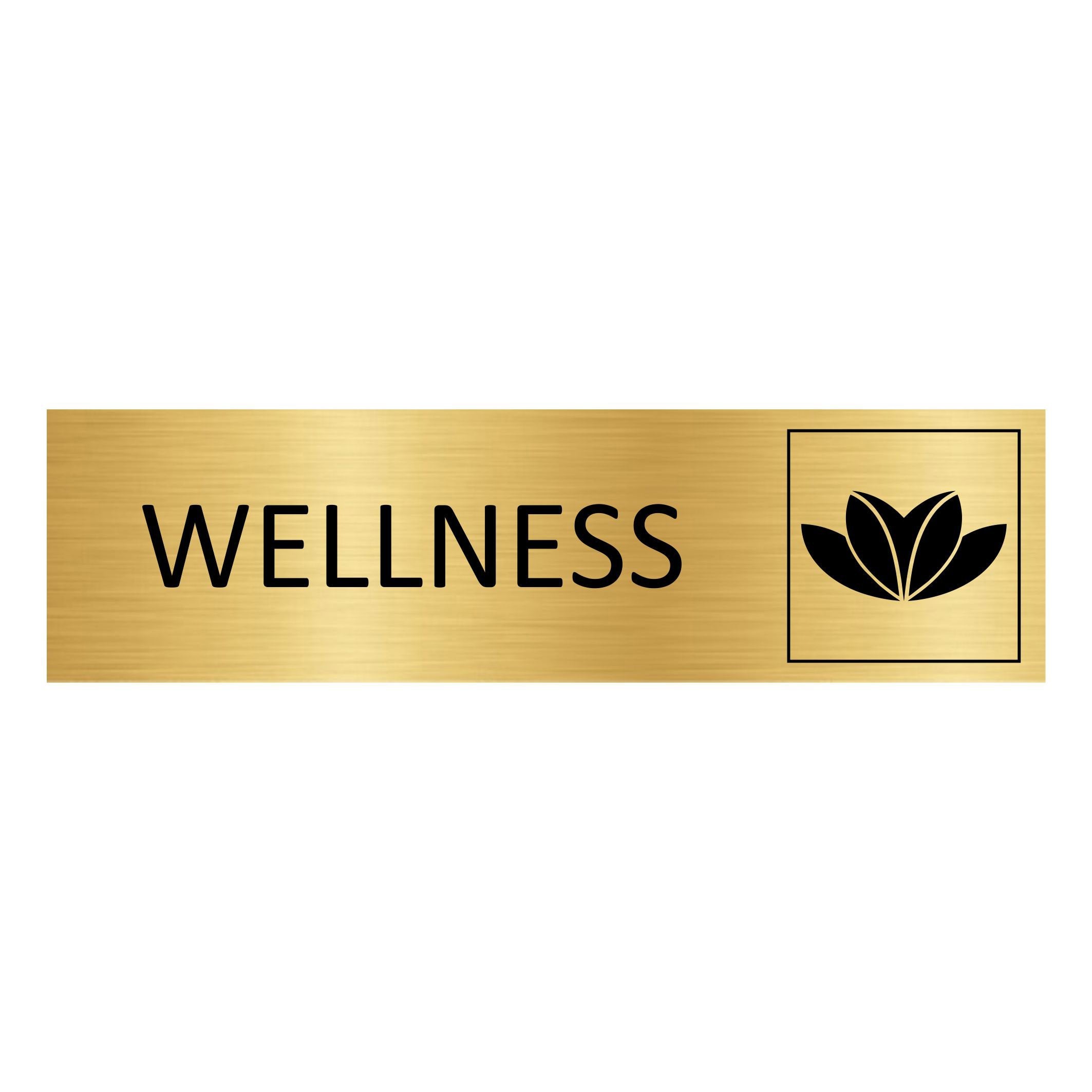 Gold-colored door sign featuring the text 'Wellness', made of high quality aluminum. The sign measures 165 x 45 mm and has double-sided tape for easy mounting. Suitable for indoor and outdoor use. Sold individually.