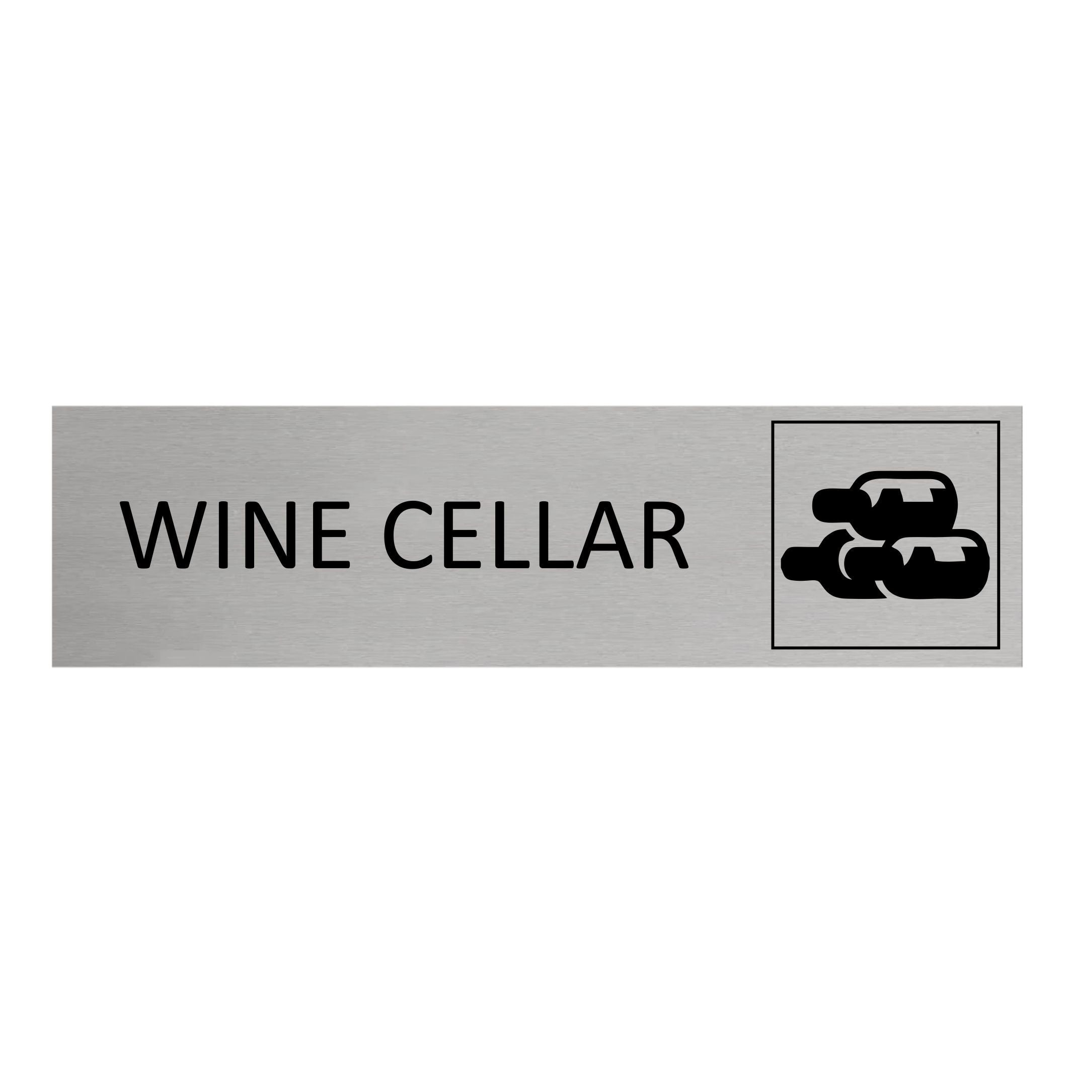 Door sign featuring the text 'Wine cellar', made of silver-colored aluminum. The sign measures 165 x 45 mm and has double-sided tape for easy mounting. Suitable for indoor and outdoor use. Sold individually.