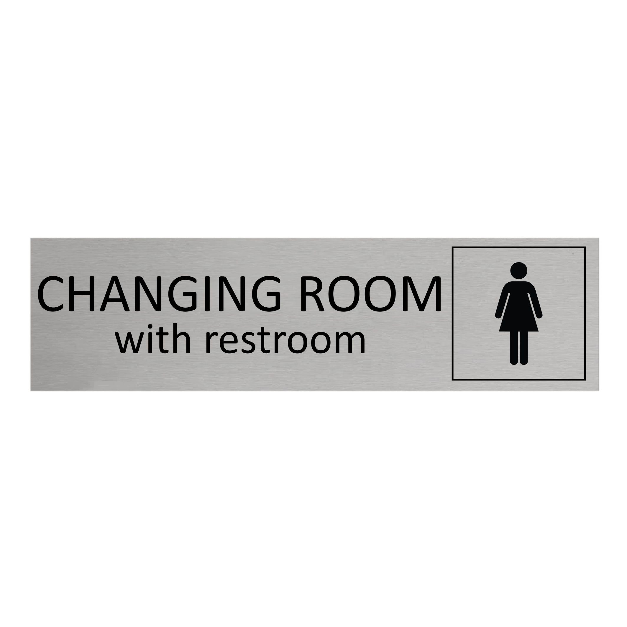 Door sign featuring the text 'Women's changing room with restroom', made of silver-colored aluminum. The sign measures 165 x 45 mm and has double-sided tape for easy mounting. Suitable for indoor and outdoor use. Sold individually.