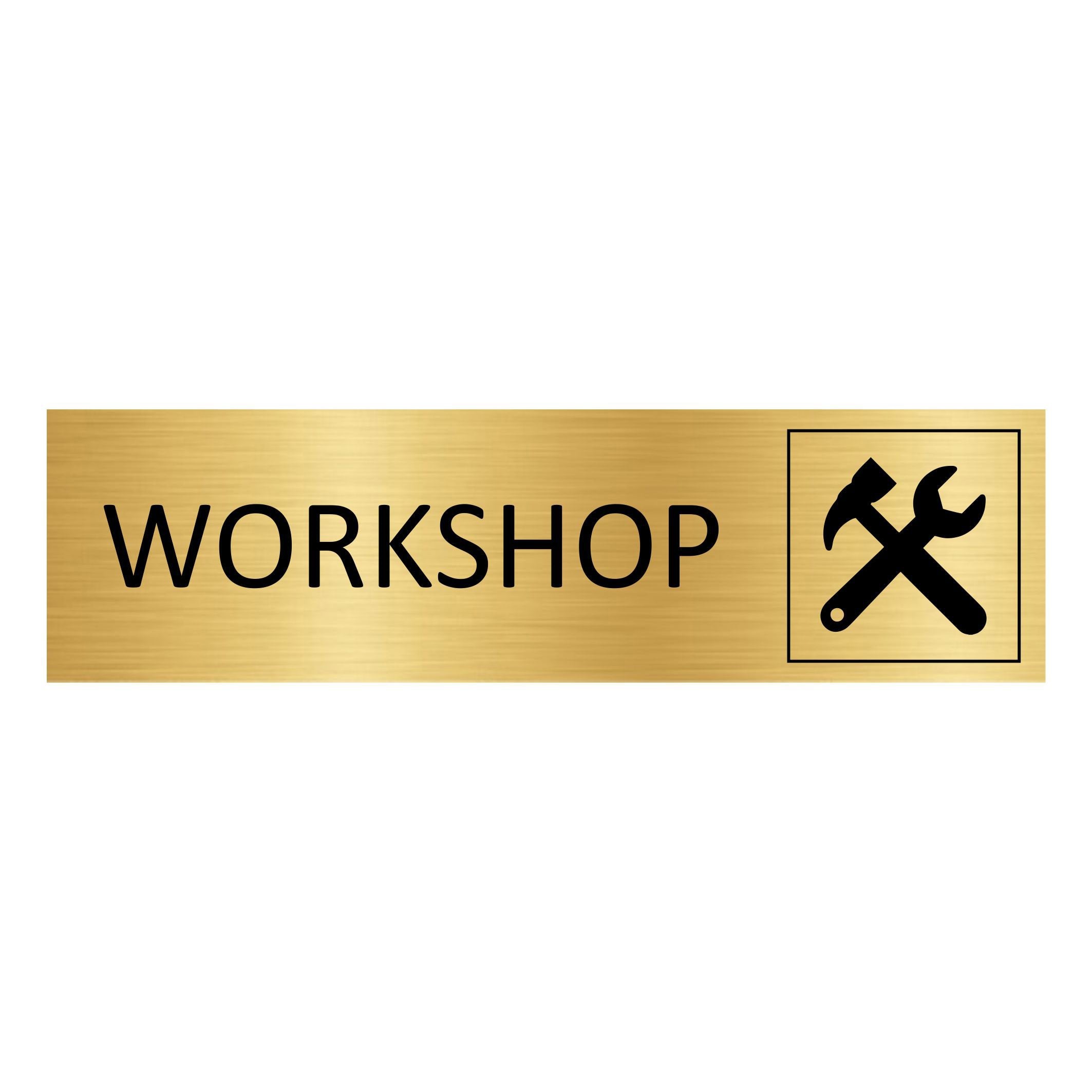 Gold-colored door sign featuring the text 'Workshop', made of high quality aluminum. The sign measures 165 x 45 mm and has double-sided tape for easy mounting. Suitable for indoor and outdoor use. Sold individually. Read more