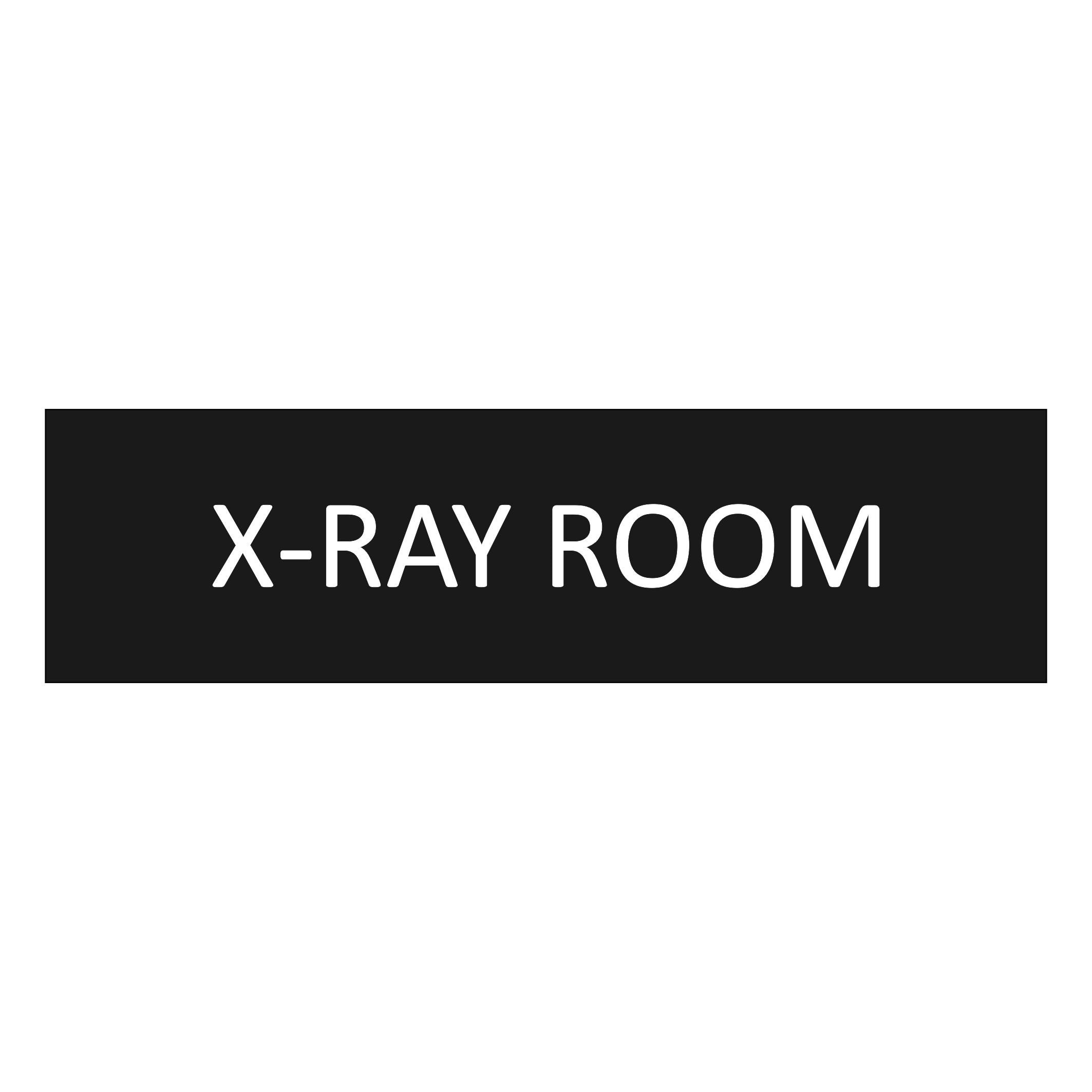 Black door sign featuring the text 'X-ray room', made of high quality aluminum. The sign measures 165 x 45 mm and has double-sided tape for easy mounting. Suitable for indoor and outdoor use. Sold individually.